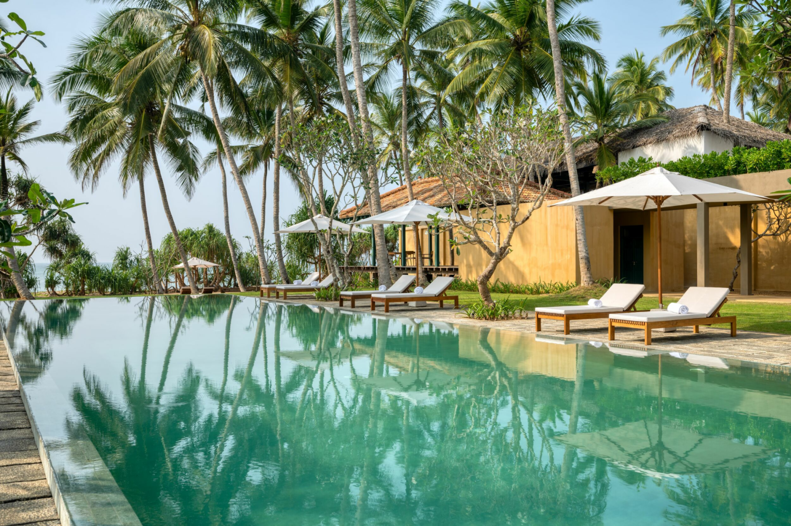 Das Kayaam House ist ein sehr schön gestaltetes Boutique-Hotel, das an einem schönen, abgelegenen Strand in der Gegend von Tangalle liegt. Das Hotel zeigt eine wunderschöne kolonial inspirierte Architektur und verfügt über schöne Sitzgelegenheiten, einen offenen, luftigen Essbereich, einen Pool und einen schönen Garten mit einer Yoga-Shala, die dazu einlädt, frühmorgens Yoga zu praktizieren. Der von hohen Palmen gesäumte und von Liegestühlen umgebene Pool ist ebenso beeindruckend wie die große Veranda, die über türkisfarbene französische Balkone in den Garten führt.