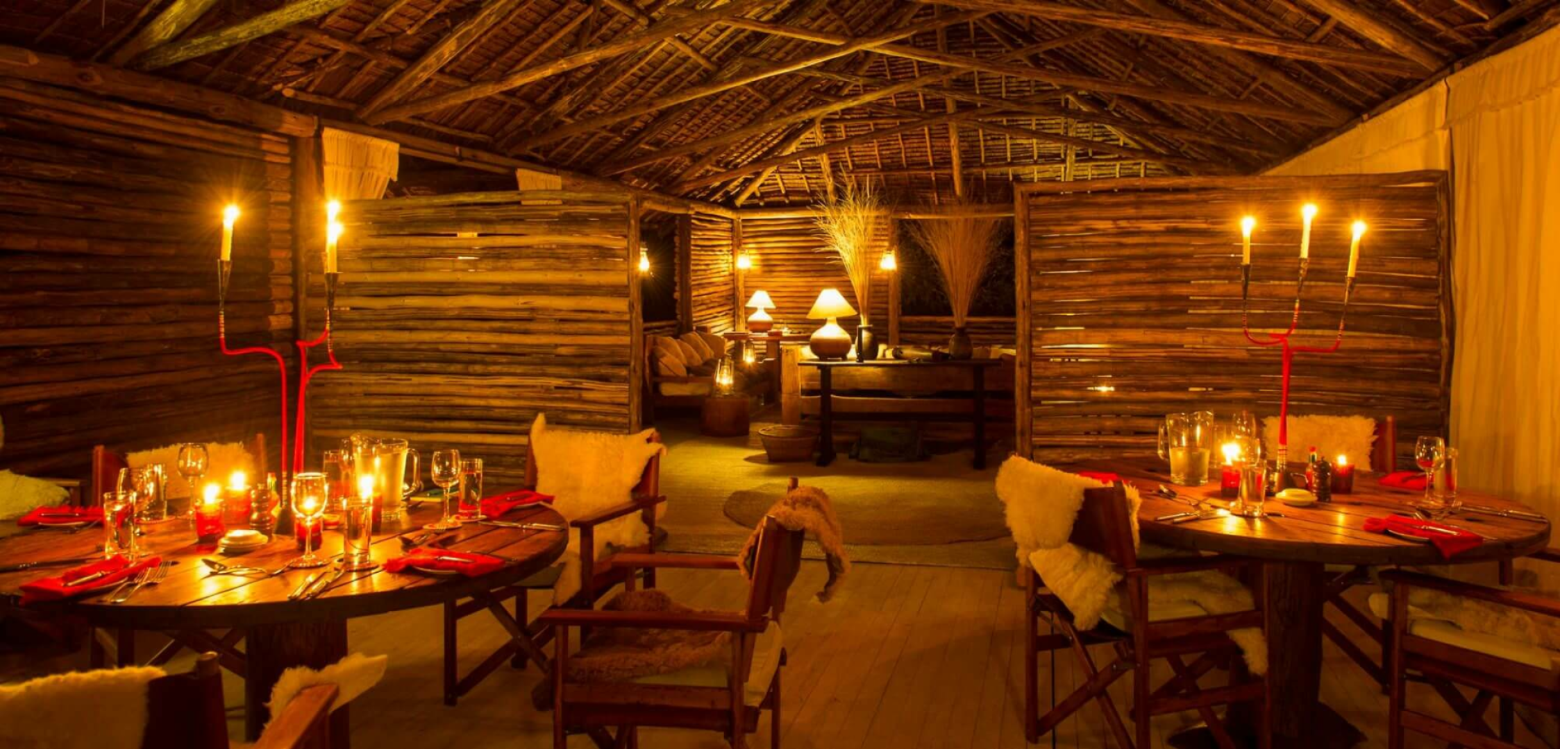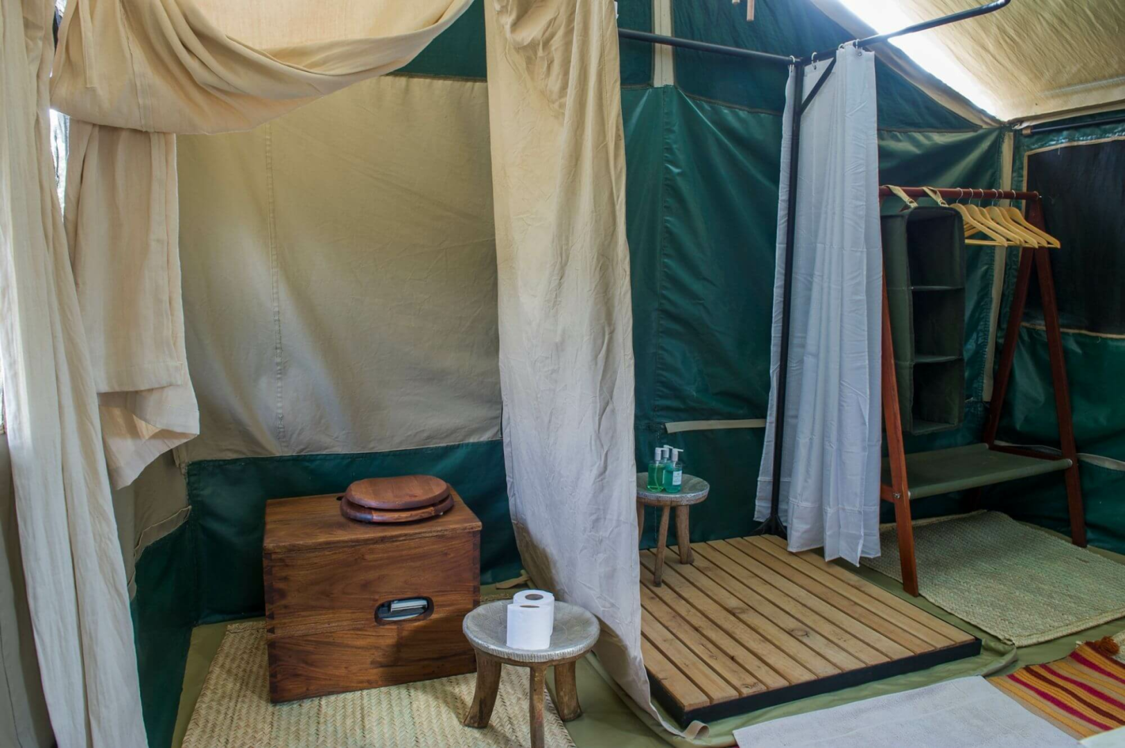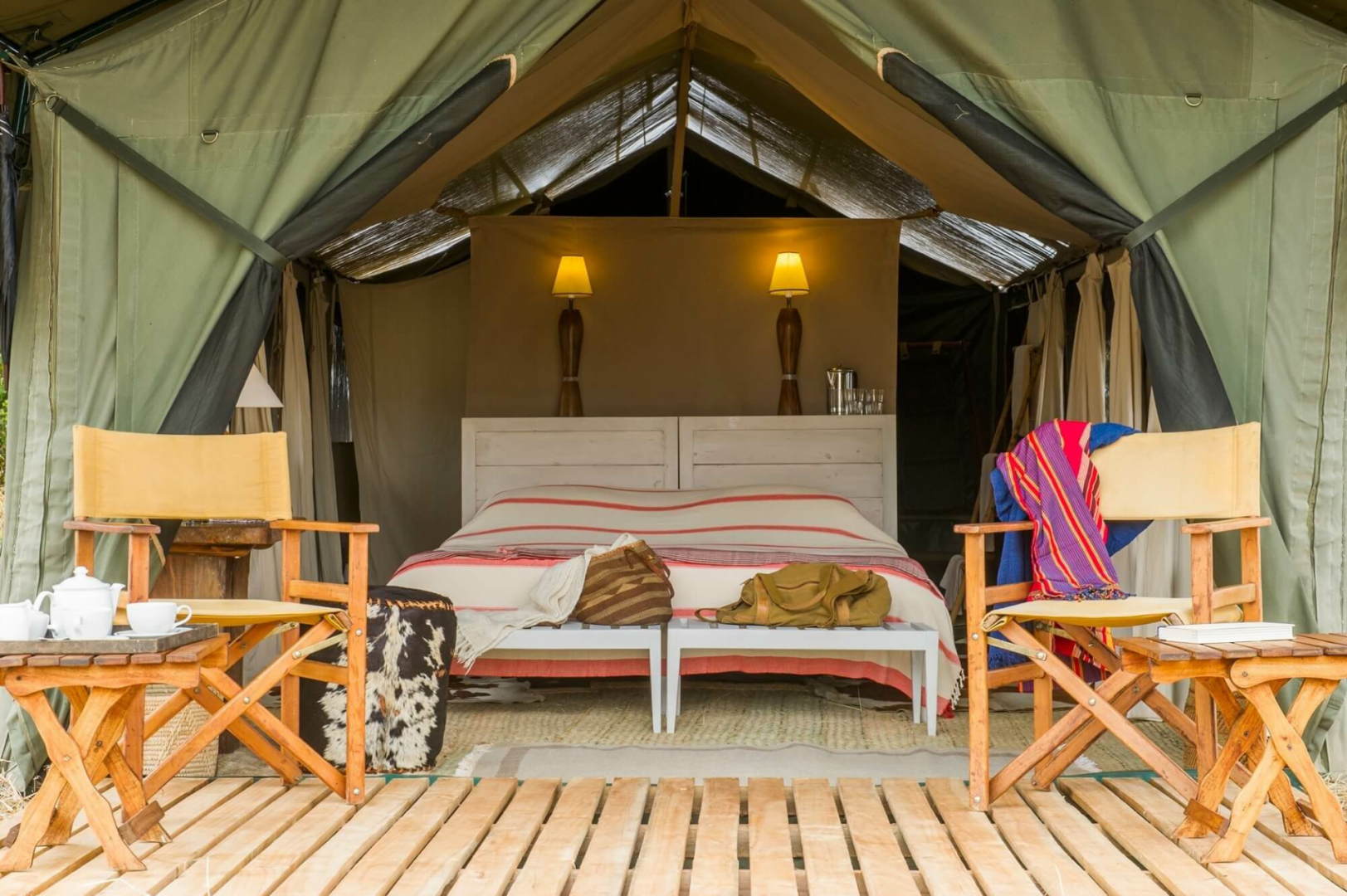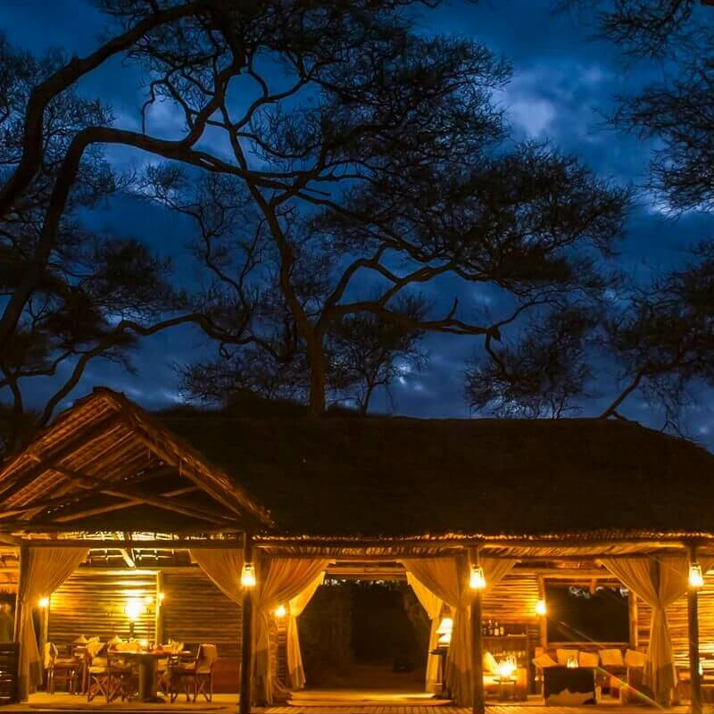 Das Camp besteht aus sechs sehr geschmackvoll eingerichteten Luxuszelten im klassischen Stil ausgestattet mit einem modernen Badezimmer. Ein rustikales halb offener Bau aus Holzstämmen unterbringt die wundervoll entspannende Lounge und den Essbereich.