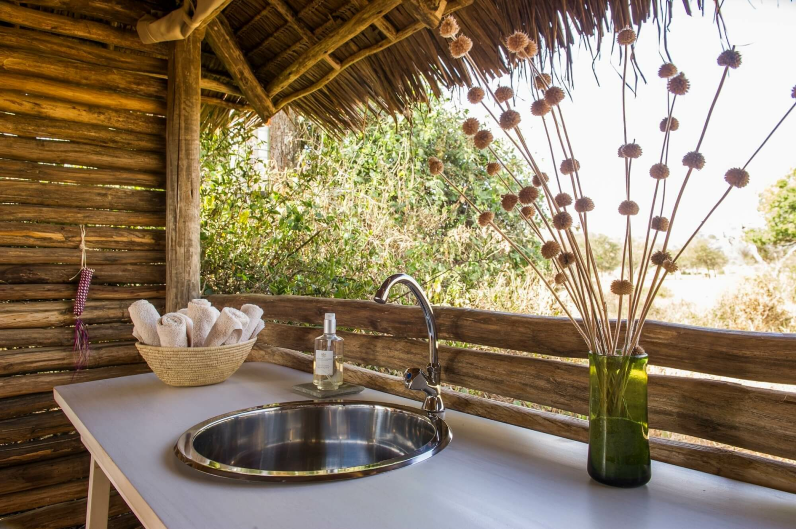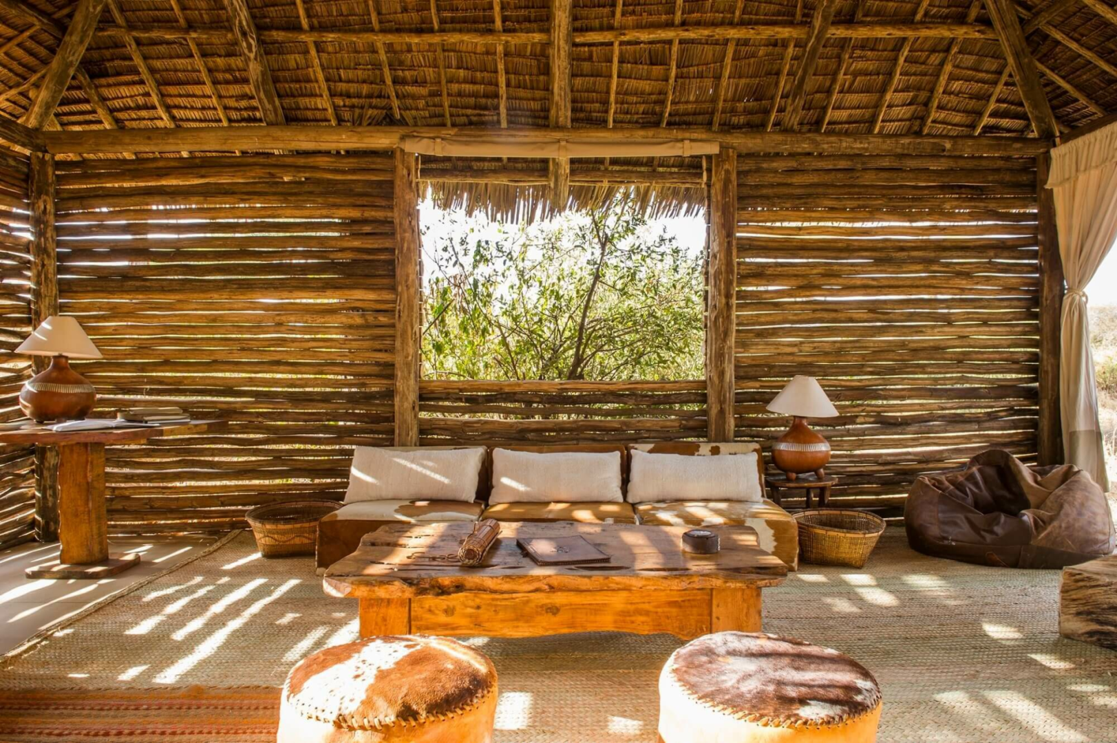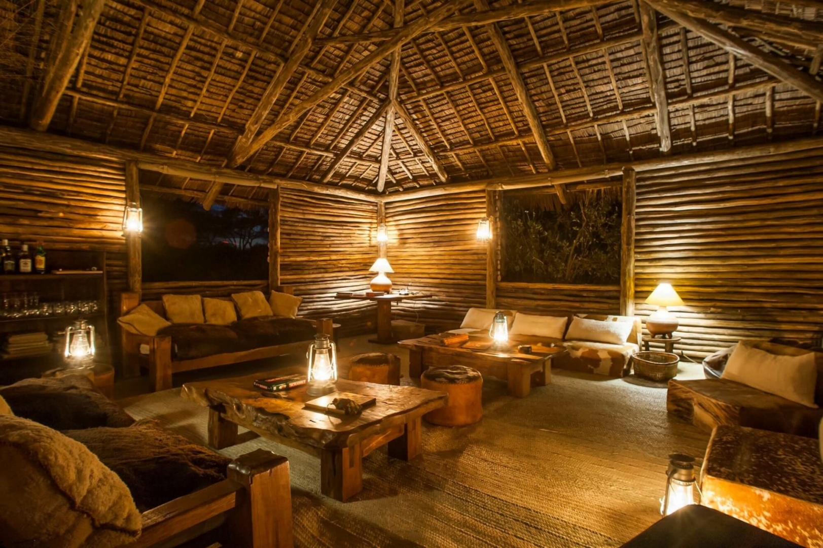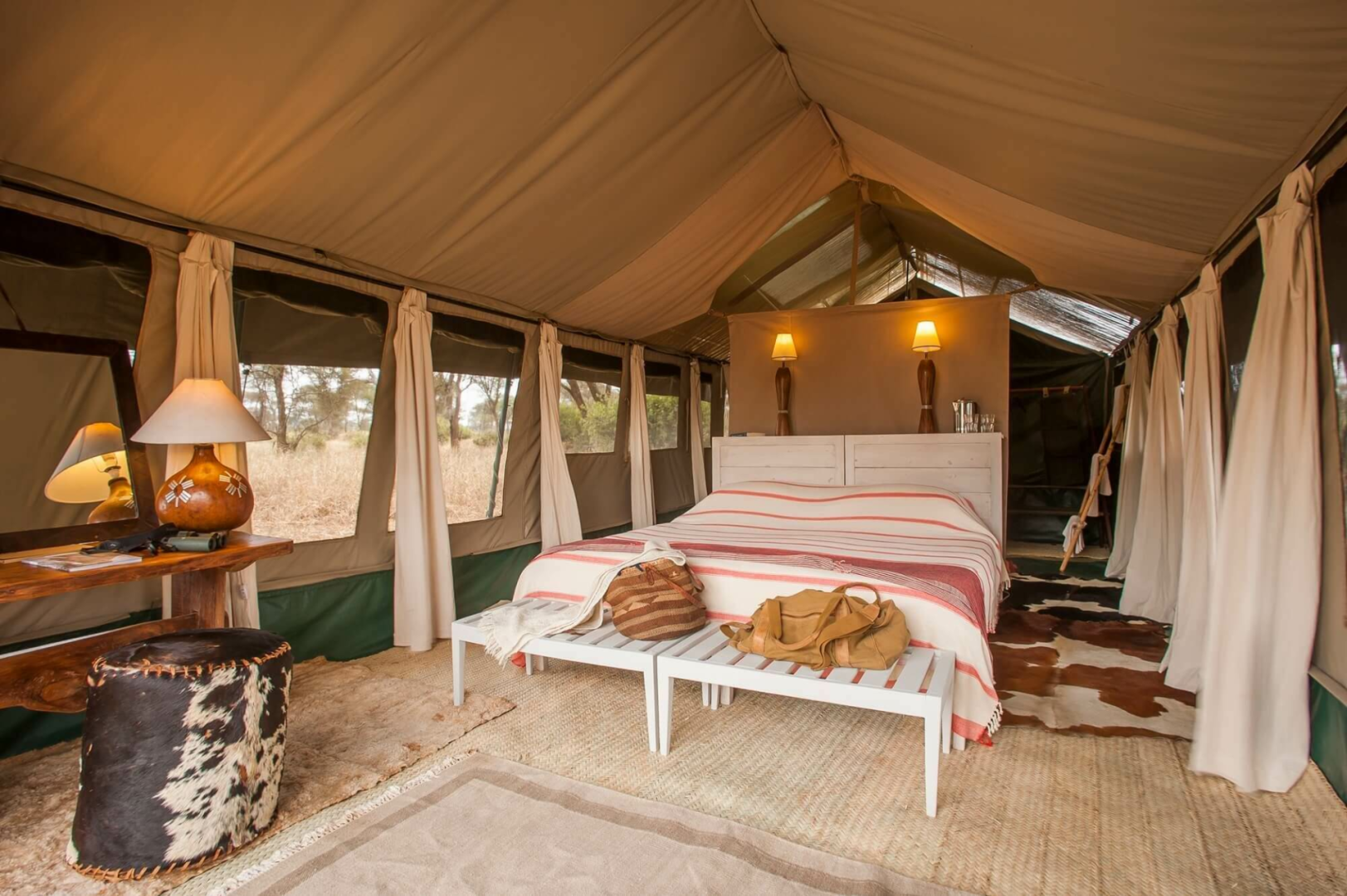 Das Camp besteht aus sechs sehr geschmackvoll eingerichteten Luxuszelten im klassischen Stil ausgestattet mit einem modernen Badezimmer. Ein rustikales halb offener Bau aus Holzstämmen unterbringt die wundervoll entspannende Lounge und den Essbereich.