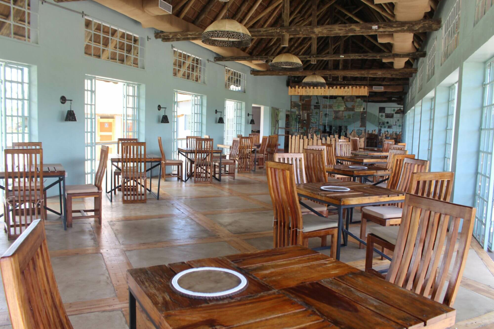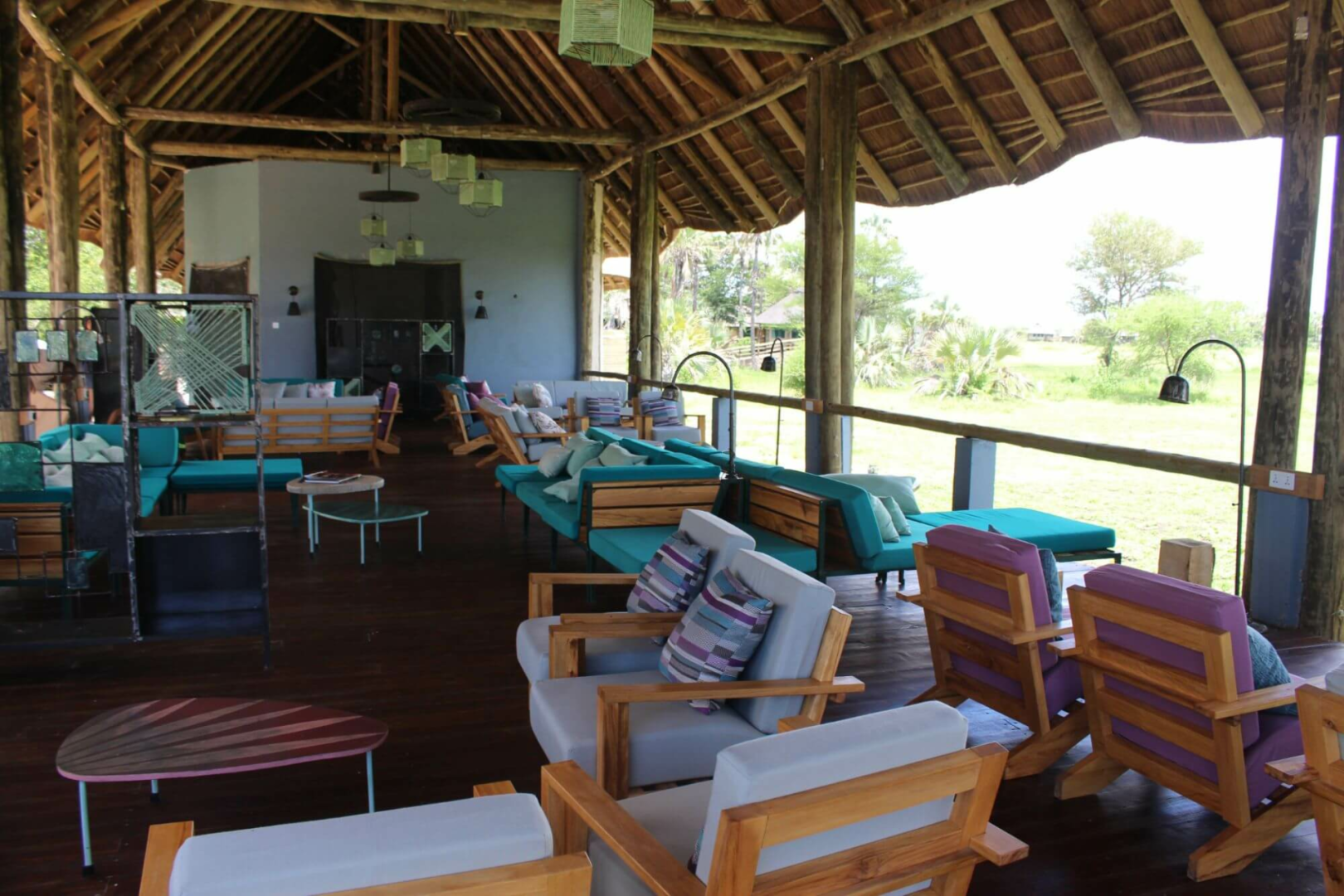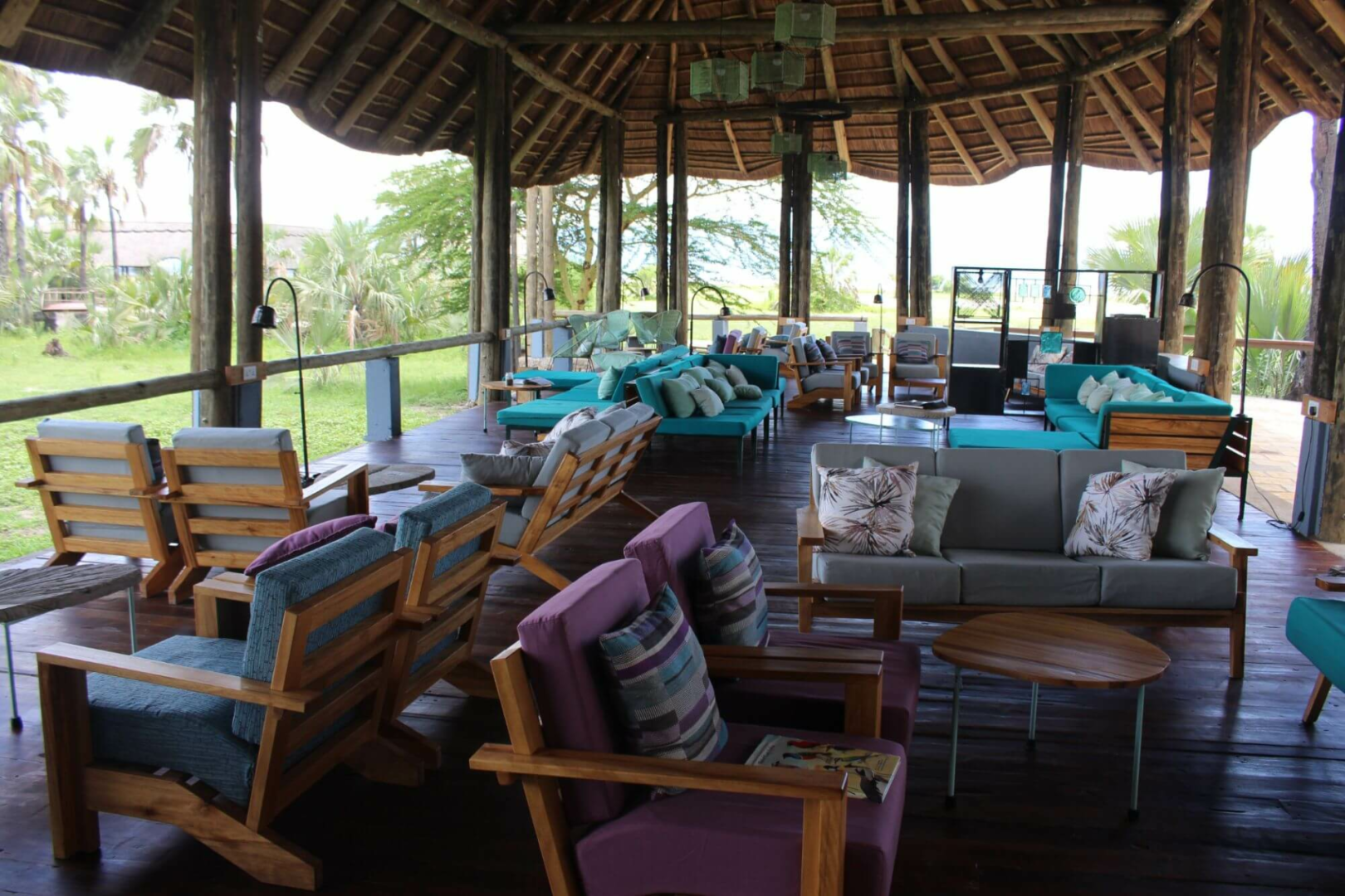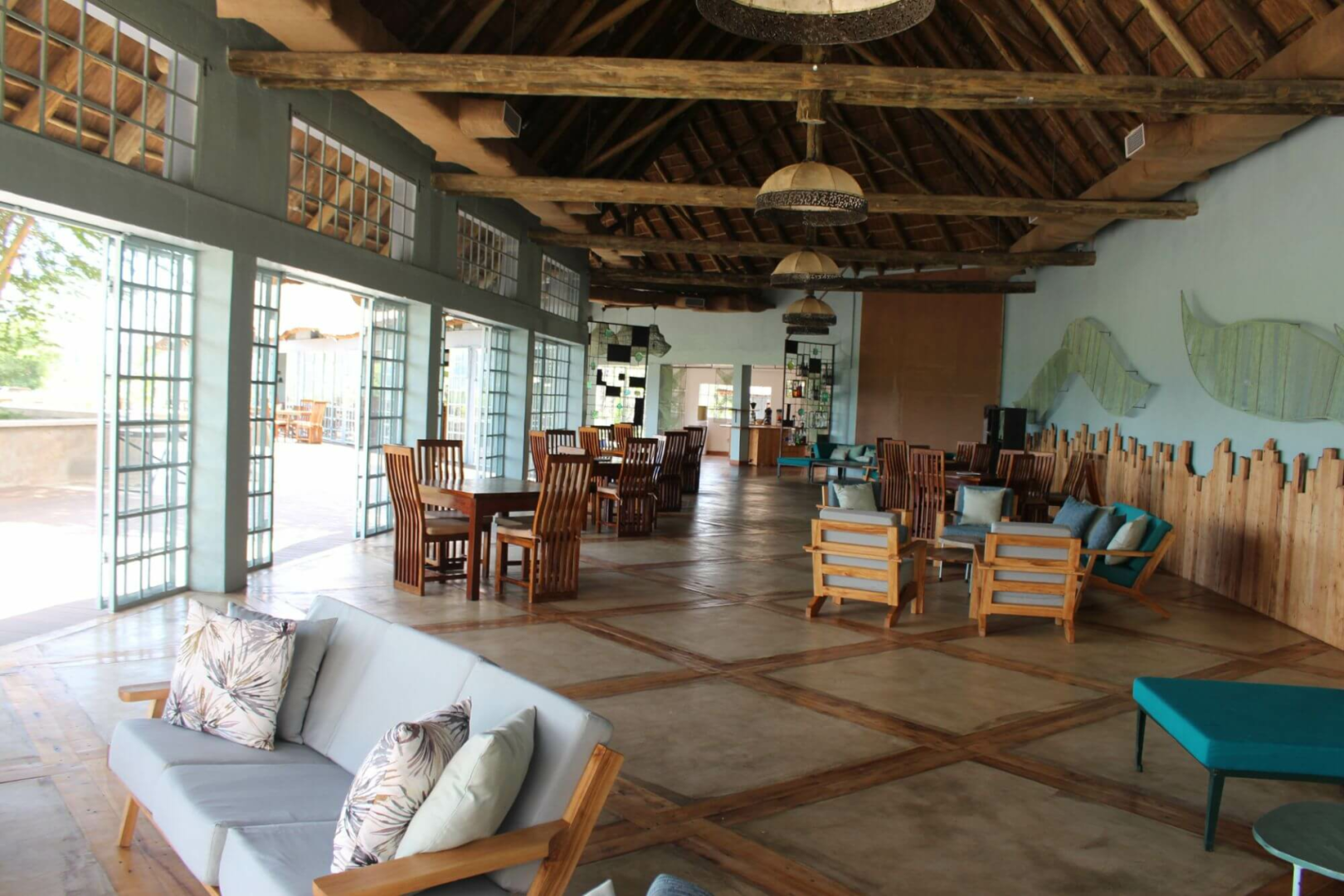 Die Gemeinschaftsbereiche sind außergewöhnlich schön gestaltet, alles ist in einem mintfarbenem Ton gehalten. Der Loungebereich mit Bar auf der linken Seite befindet sich ebenso wie das Restaurant mit großer Terrasse auf der rechten Seite unter Reetdach, welches