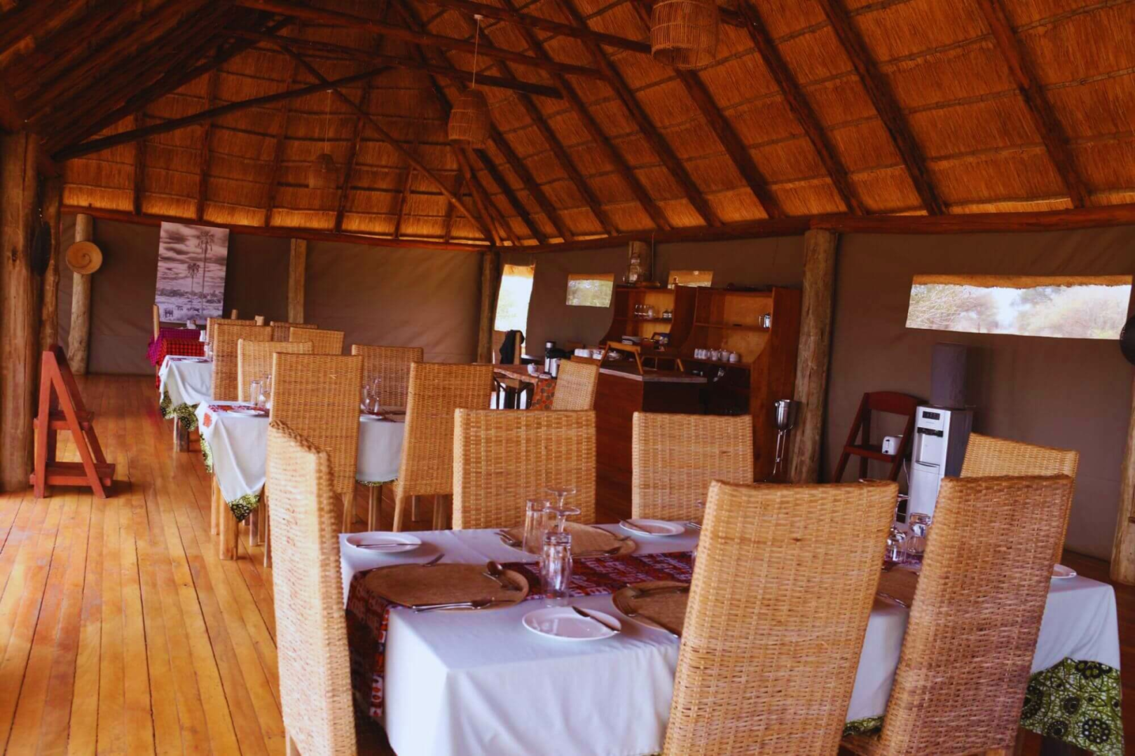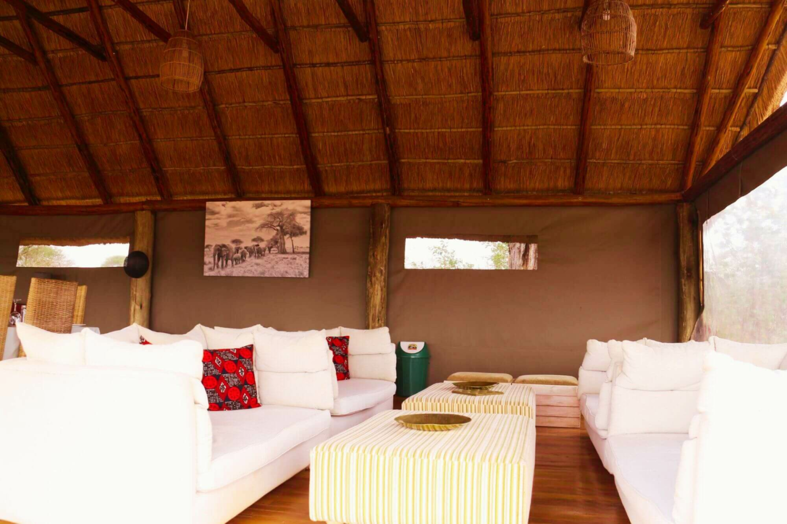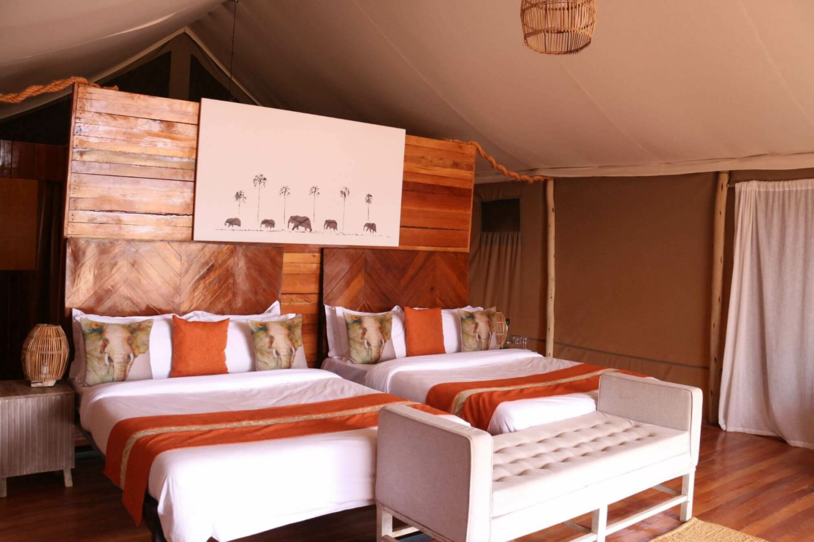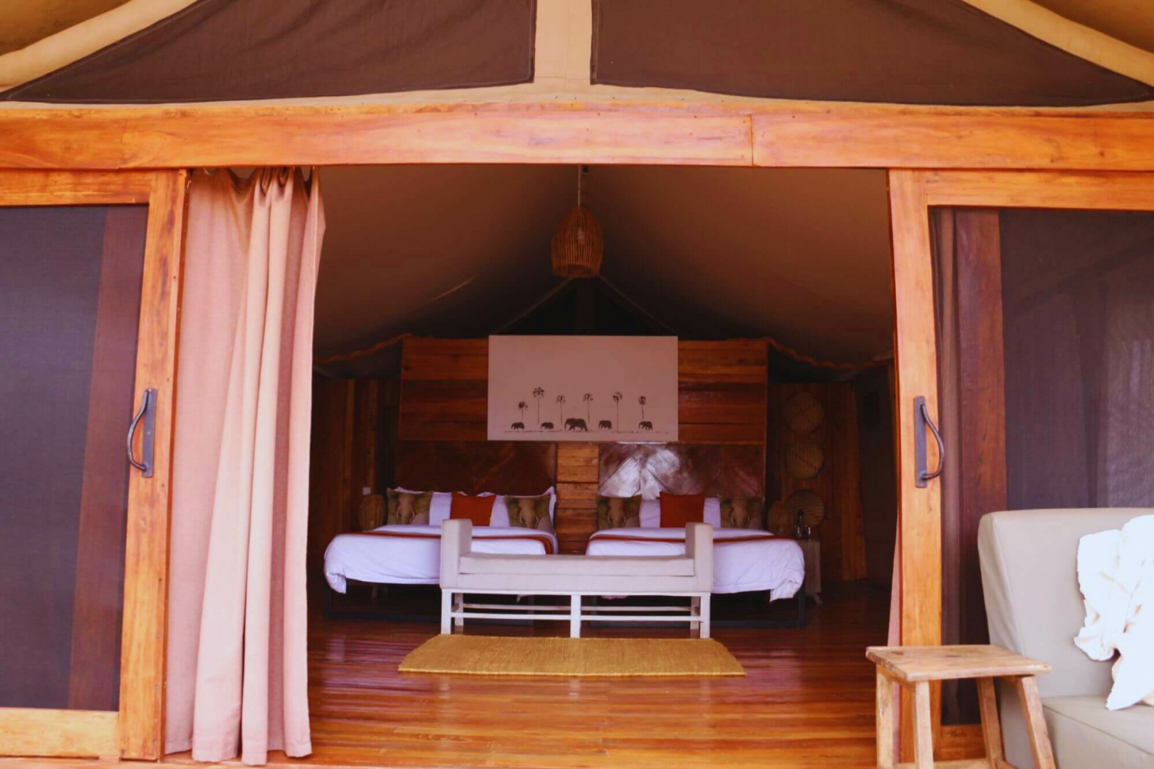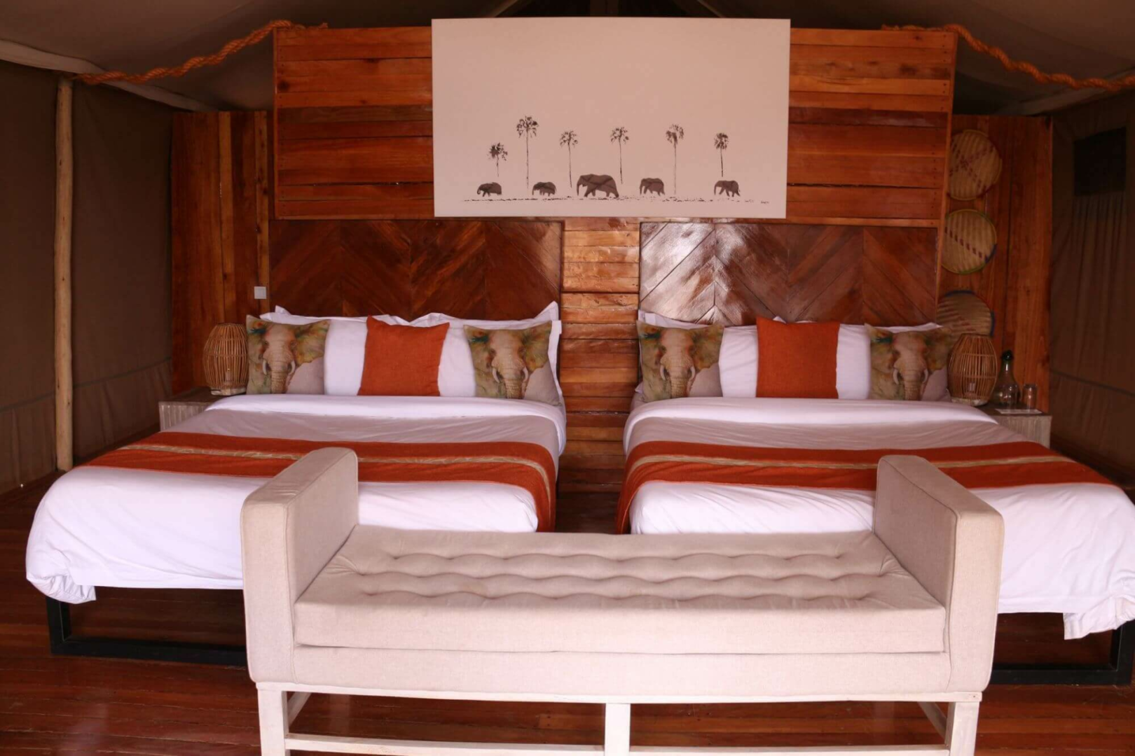 Die Gäste werden in vierzehn größeren als den Standard-Safarizelten willkommen geheißen, die auf Holzplattformen stehen, was ein wenig von der Nähe zum Busch ablenkt. Die Einrichtung ist elegant und gut ausgestattet, man wird hier nichts vermissen. Die Badezimmer sind geräumig und verfügen über eine Eimerdusche, eine separate Toilette und zwei Waschbecken.