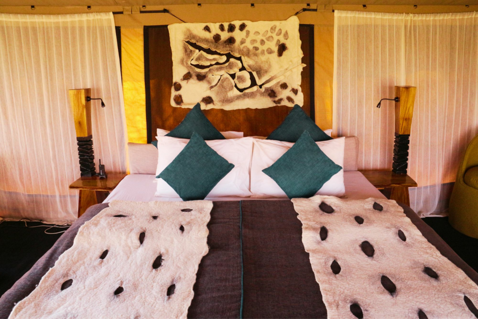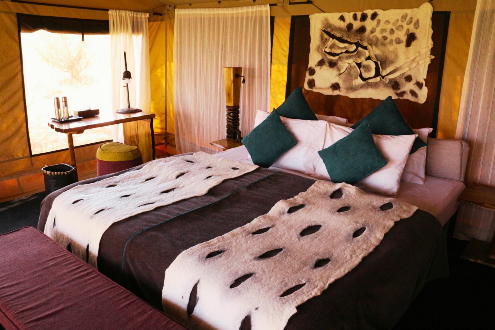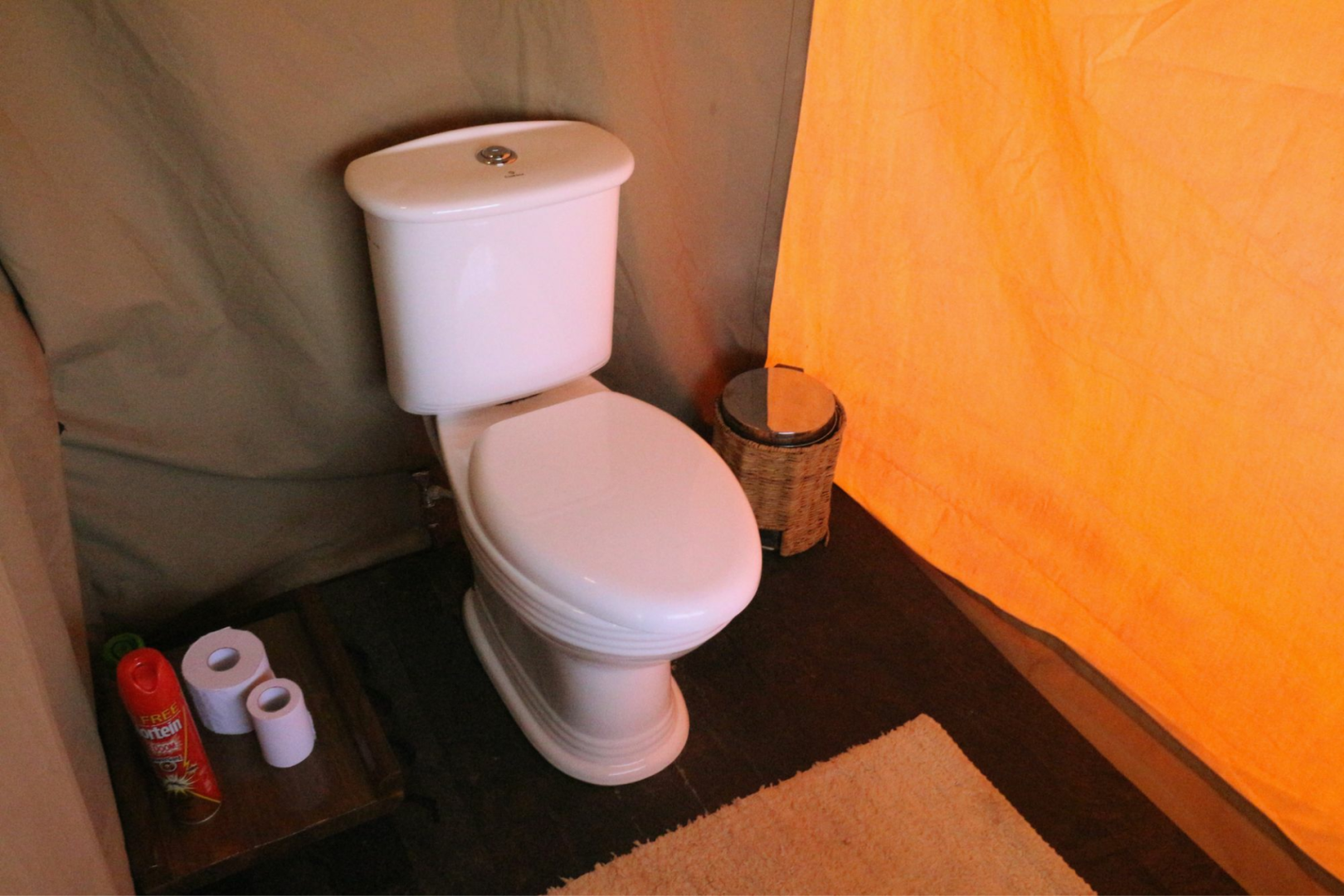Fünf Gäste-Safarizelte befinden sich rechts und links vom Gemeinschaftsbereich. Die Zelte sind in mit Queen Size oder zwei Betten ausgestattet und alle sehr gut eingerichtet. Uns gefällt die Aufstellung direkt auf dem Boden ohne erhöhte Plattformen. Der Boden des Zeltinneren ist mit Teppichen ausgelegt, die Betten sind sehr bequem. Es gibt einen kleinen Schreibtisch mit Lampe und Stuhl, zwei Betttische, eine große Bank und einen Schrank. Das Bad ist ebenfalls gut ausgestattet mit einer separaten Buschdusche, zwei Waschbecken und der Toilette.