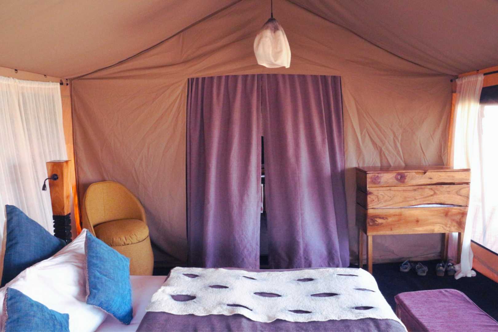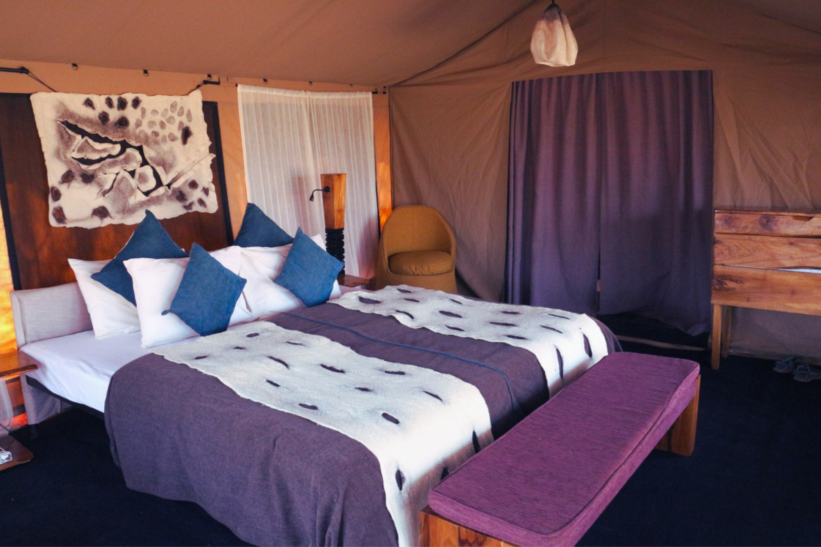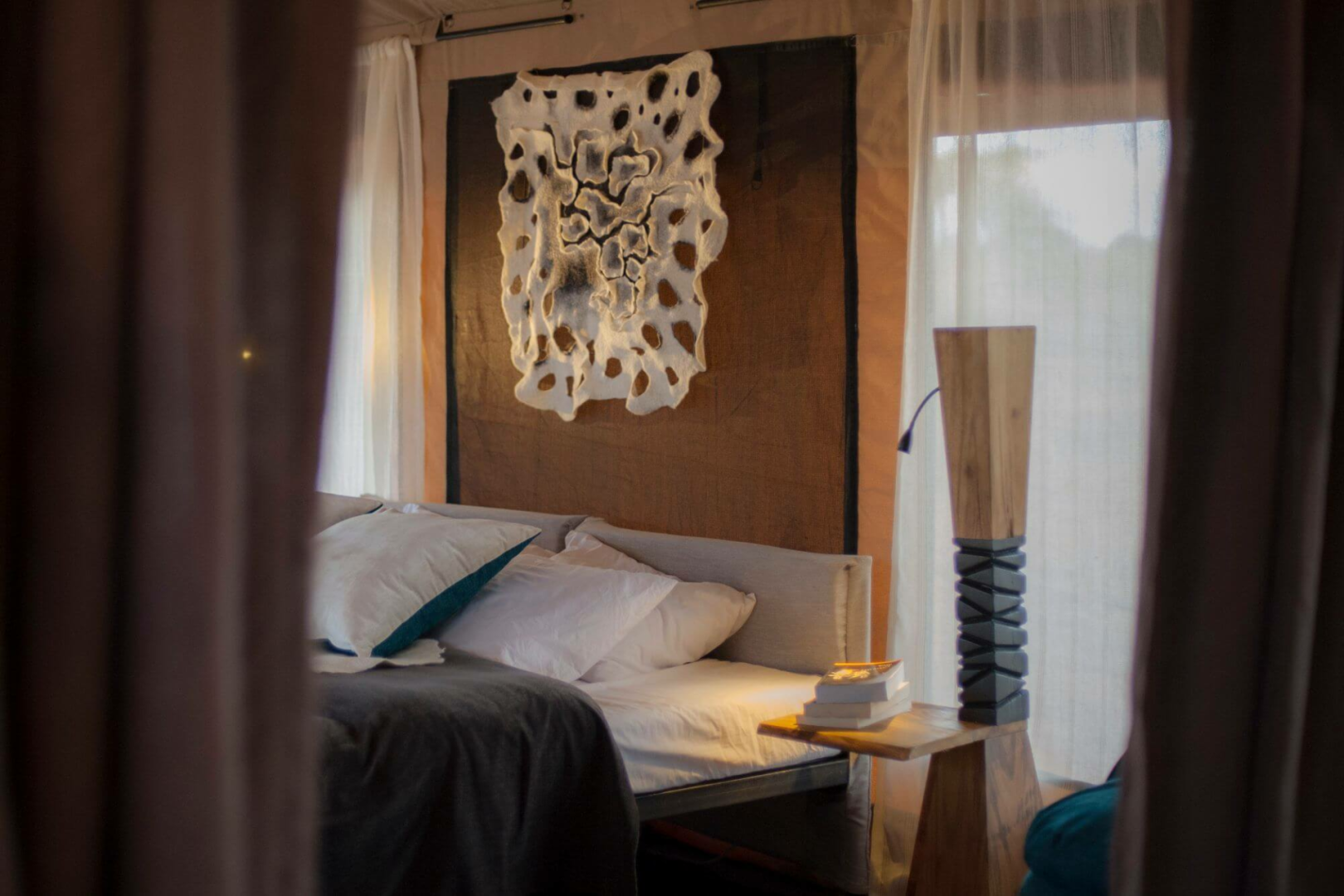Fünf Gäste-Safarizelte befinden sich rechts und links vom Gemeinschaftsbereich. Die Zelte sind in mit Queen Size oder zwei Betten ausgestattet und alle sehr gut eingerichtet. Uns gefällt die Aufstellung direkt auf dem Boden ohne erhöhte Plattformen. Der Boden des Zeltinneren ist mit Teppichen ausgelegt, die Betten sind sehr bequem. Es gibt einen kleinen Schreibtisch mit Lampe und Stuhl, zwei Betttische, eine große Bank und einen Schrank. Das Bad ist ebenfalls gut ausgestattet mit einer separaten Buschdusche, zwei Waschbecken und der Toilette.