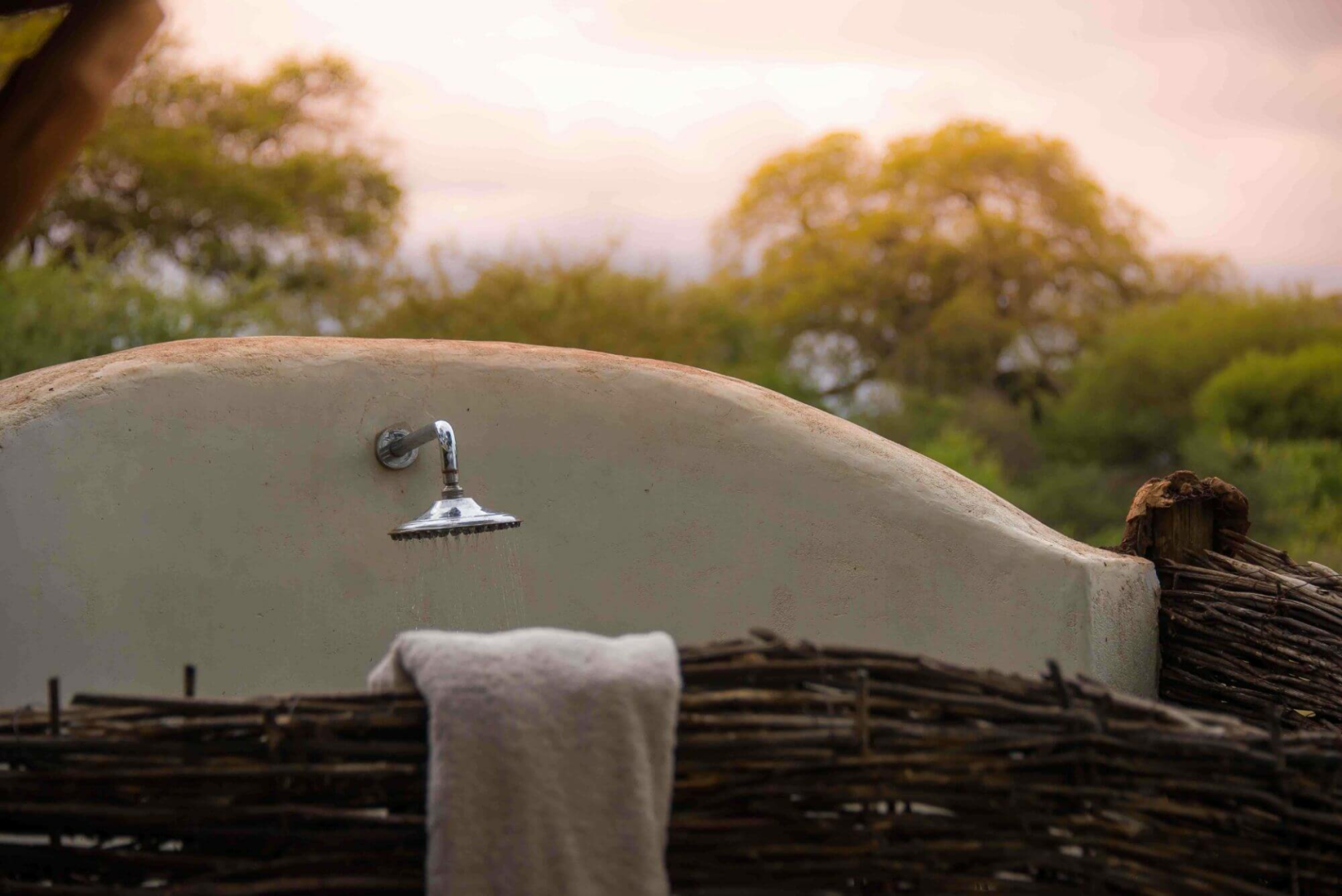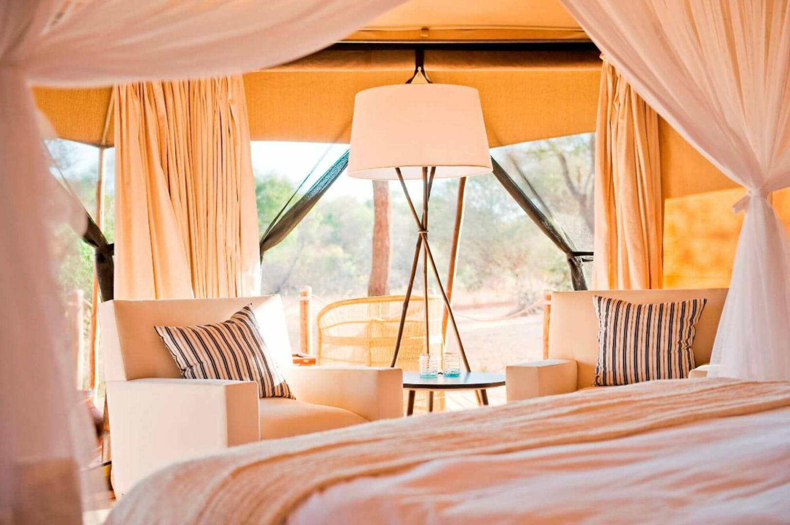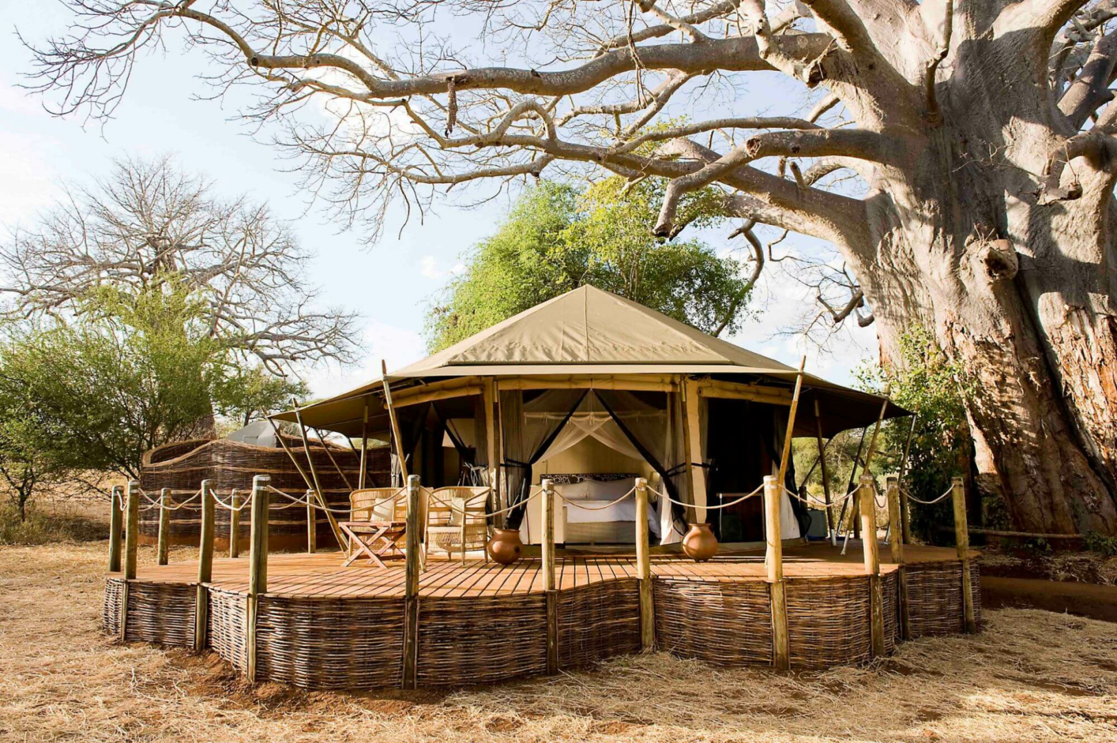Die Unterbringung erfolgt in überdurchschnittlich großen Luxuszelten mit Terrasse sowie Innen- und Außendusche. Die unter reetgedeckten, offenen Bauten stilvoll dekorierten Lounge- und Essbereiche blicken auf einen imposanten, hundert Jahre alten, riesigen Baobab. Ein Pool ist auch vorhanden. Service und Verpflegung sind erstklassig.