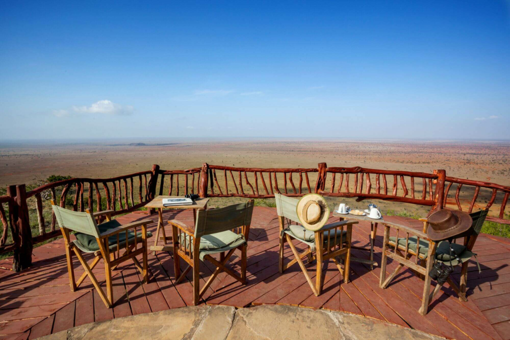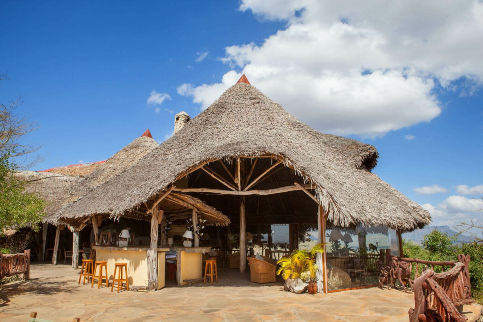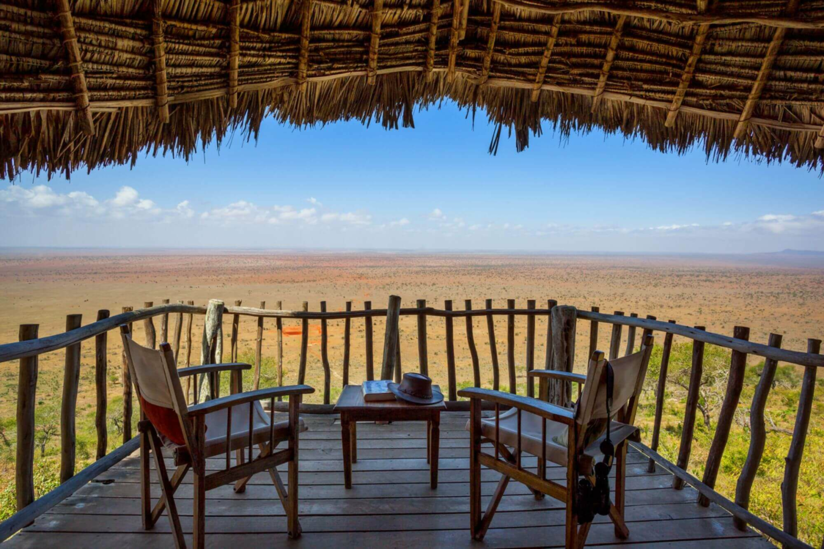 Lion's Bluff Lodge ist eine mittelgroße Safari-Lodge der mittleren Preisklasse im Tsavo West, Ostkenia, die von einer wahrhaftig spektakulären Lage am höchsten Punkt eines Bergrückens profitiert, nicht umsonst erhielt Lions Bluff den Spitznamen „Aussicht mit Lodge“. Von der Hauptlodge öffnet sich ein eindrucksvolles 270-Grad-Panoramabild über Tsavo West. Sonst ist die Lodge an sich angenehm rustikal, mit dem typischen Reetdach, Steinwänden und viel unverarbeitetem Holz. Der Loungebereich unter Reetdach ist auf einer Seite halb offen, um so den spektakulären Blick zu ermöglichen und ist mit Kamin und vielen Sesseln aus Rattan ausgestattet. Es gibt natürlich auch ein großes Freiluft-Beobachtungsdeck mit Feuerstelle und eine große Terrasse mit Holztischen, wo das Frühstück gerne serviert wird. Ein großes Glasfenster trennt die Terrasse vom eigentlichen, geschlossenen Restaurantbereich.