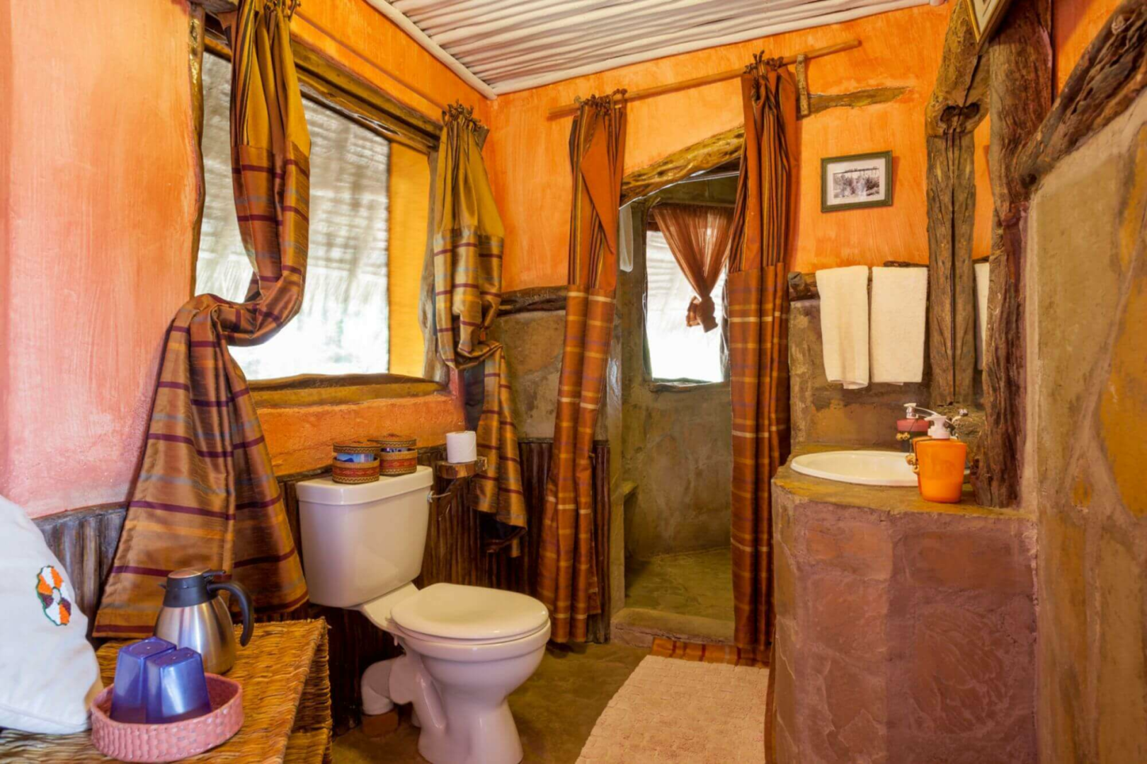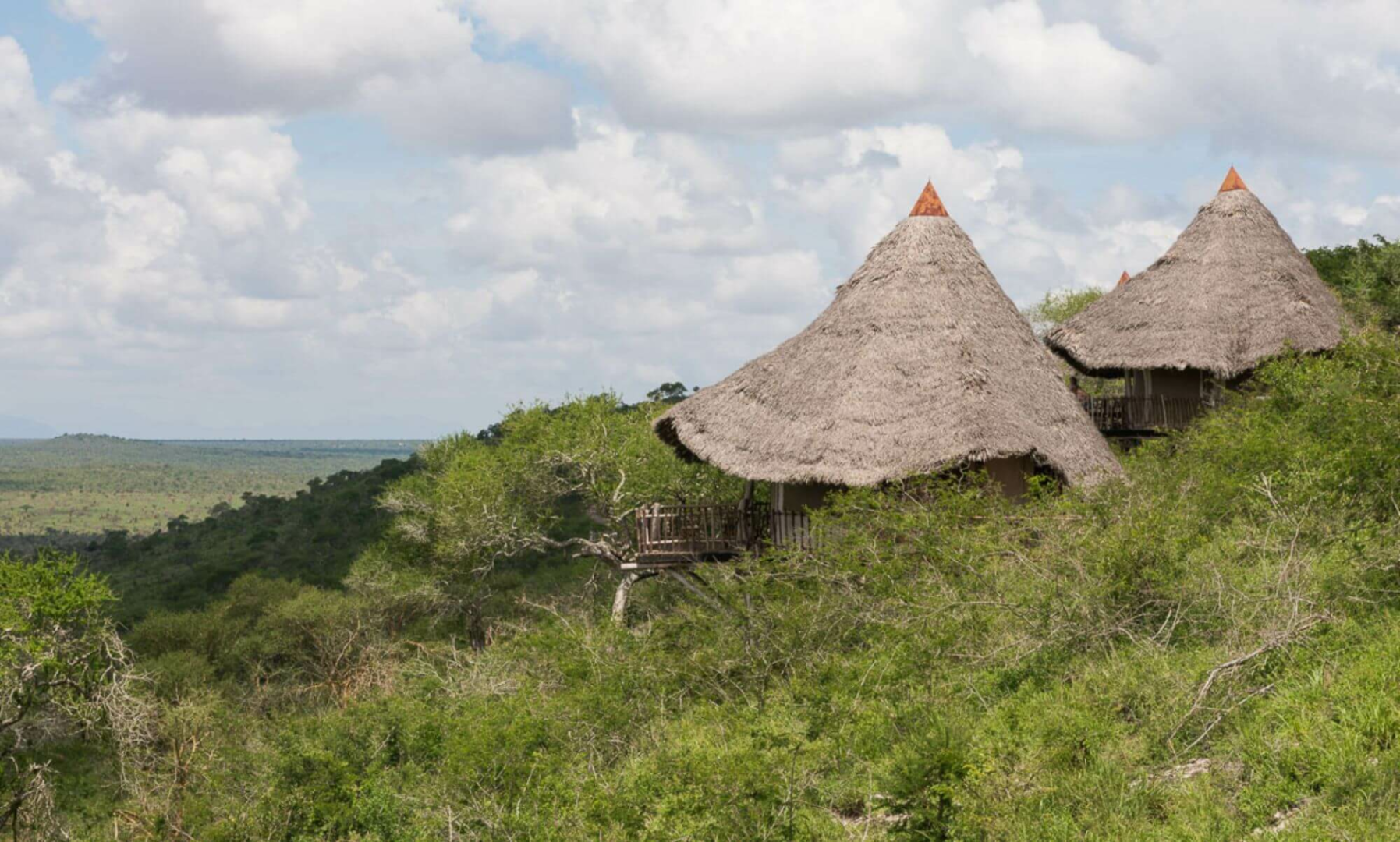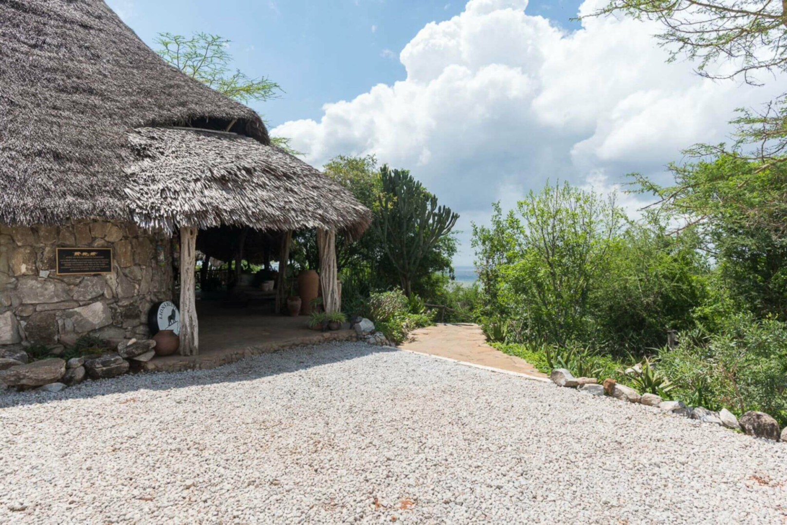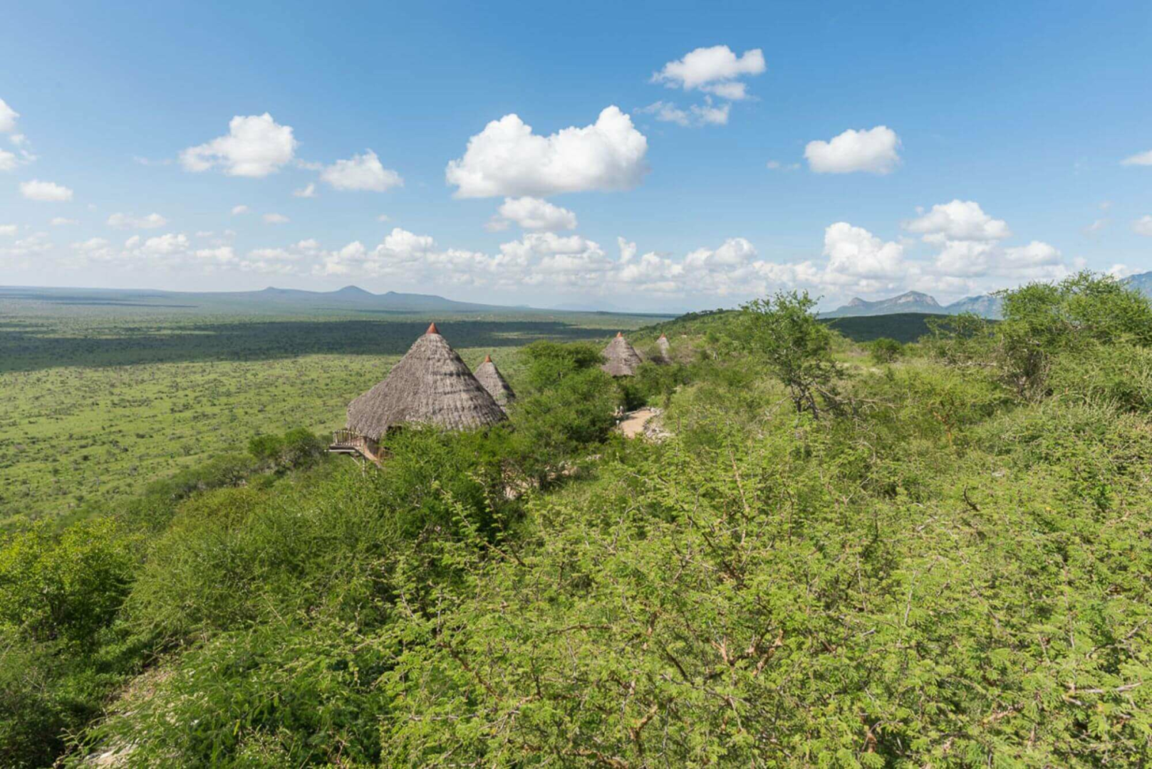 Lange Steinwege von bis zu 400 Metern führen von der Lounge zu den 12 Cottages. Diese sind diskret in den Busch eingebettet und mit recht viel Abstand voneinander gelegen, um eine große Privatsphäre zu gewährleisten. Die Cottages entlang der Bergkante sind an sich eine Mischung aus Leinen und sehr viel Reet, von außen könnte man die Cottages von einer der typischen Behausungen der Einheimischen kaum unterscheiden. Erst wenn man sich annähert, entdeckt man die Holzveranda mit dem Traumblick und ein komfortables Zimmer mit einem äußerst originellen und sehr rustikalen Bett. Die Badezimmer haben massive, weiß getünchte Wände und Decken sowie Buschduschen.
