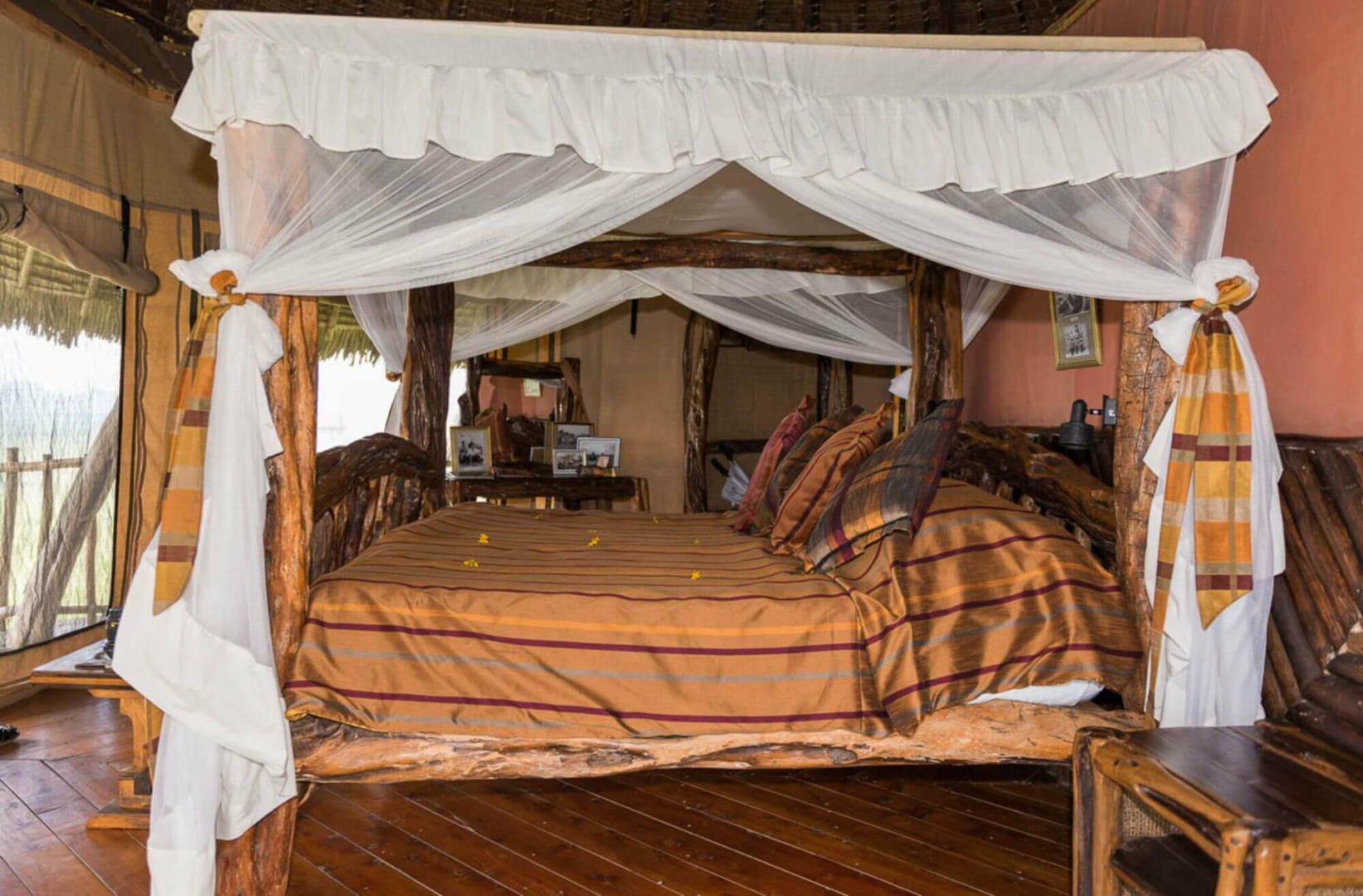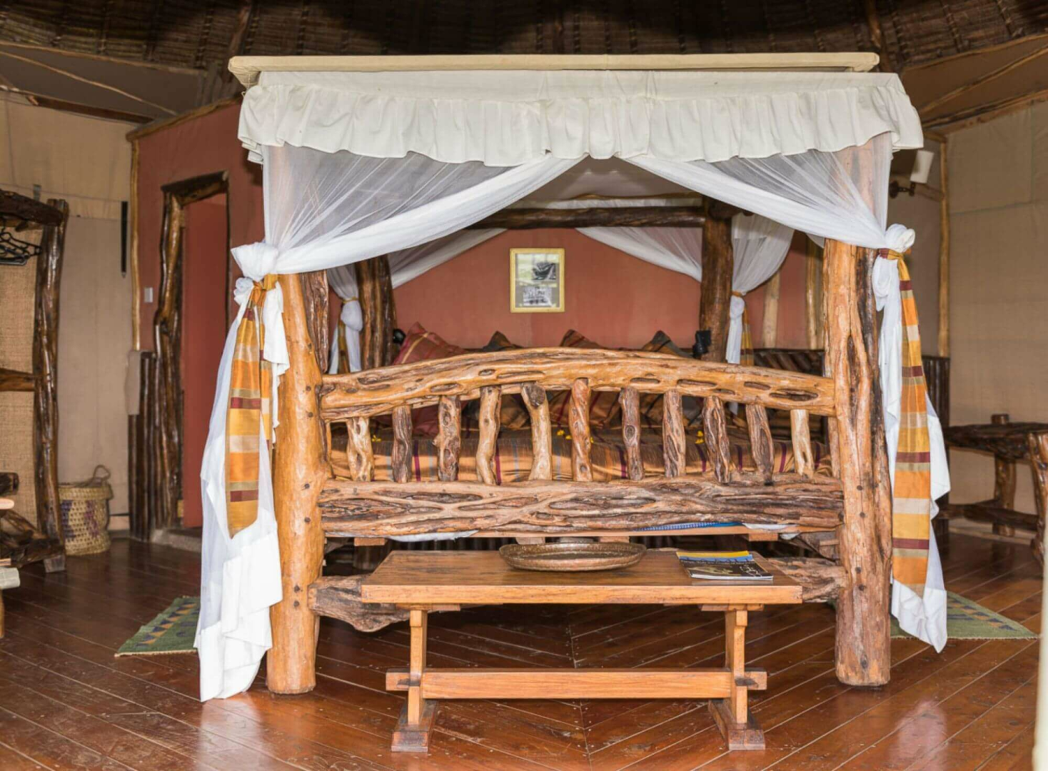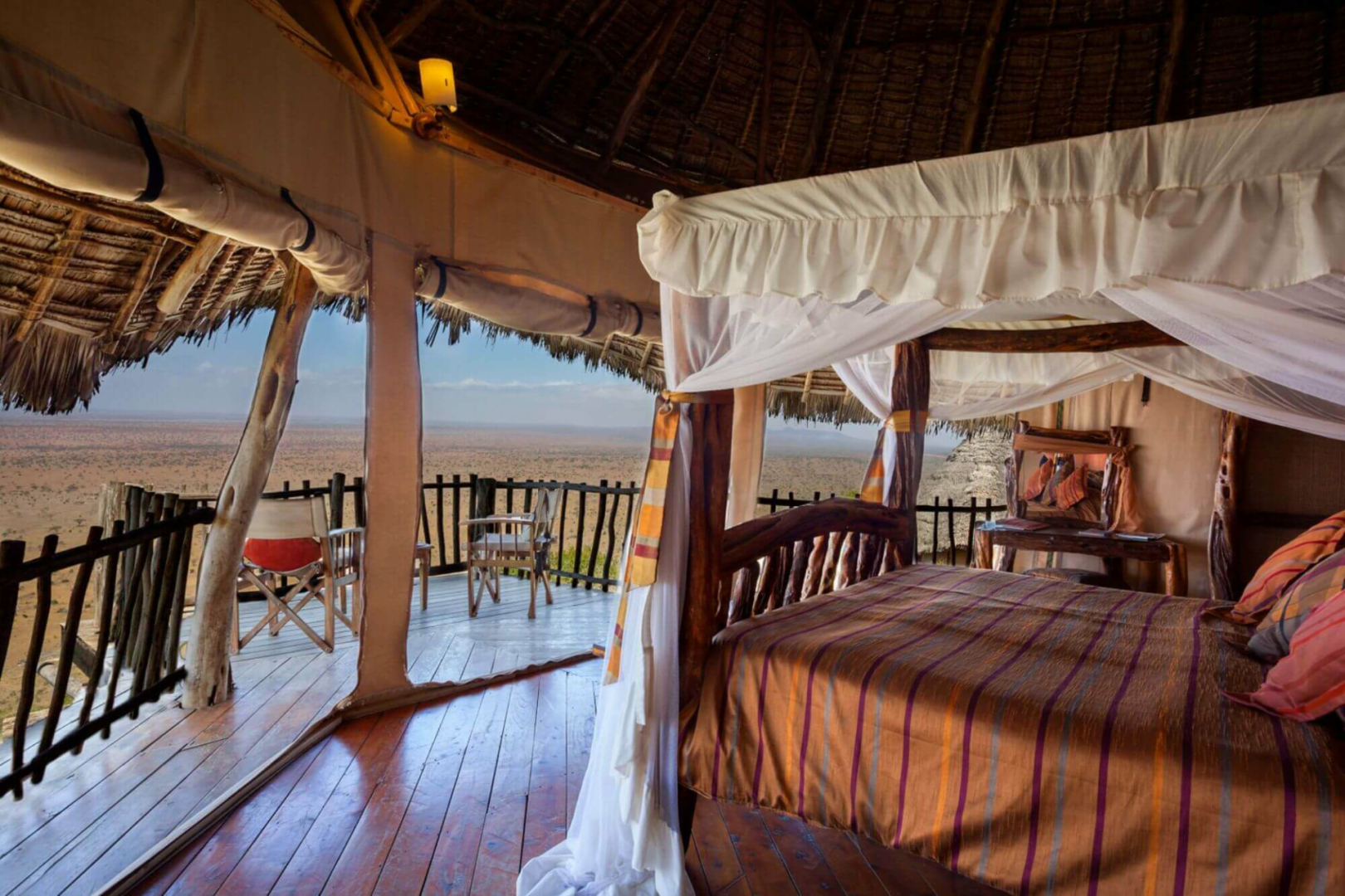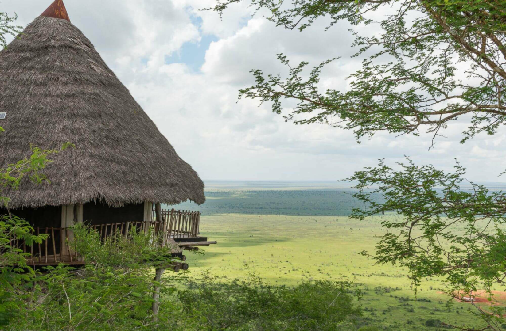 Lange Steinwege von bis zu 400 Metern führen von der Lounge zu den 12 Cottages. Diese sind diskret in den Busch eingebettet und mit recht viel Abstand voneinander gelegen, um eine große Privatsphäre zu gewährleisten. Die Cottages entlang der Bergkante sind an sich eine Mischung aus Leinen und sehr viel Reet, von außen könnte man die Cottages von einer der typischen Behausungen der Einheimischen kaum unterscheiden. Erst wenn man sich annähert, entdeckt man die Holzveranda mit dem Traumblick und ein komfortables Zimmer mit einem äußerst originellen und sehr rustikalen Bett. Die Badezimmer haben massive, weiß getünchte Wände und Decken sowie Buschduschen.