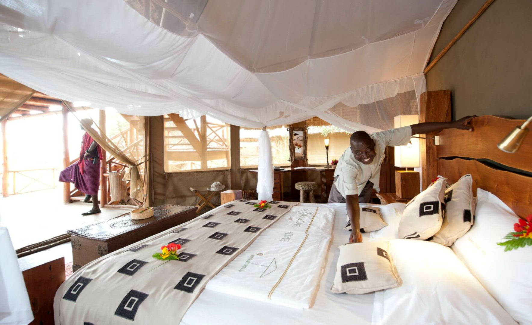 Die Gäste werden in zwanzig achteckigen Bandas auf Steinboden mit Leinwänden und unter Reetdach untergebracht. Jede Banda hat eine kleine Veranda mit Stühlen, von der man die Landschaft genießen kann. Die Inneneinrichtung ist simpel, aber gleichzeitig komfortabel mit Himmelbett, Tisch und Ablagemöglichkeiten und einem Badezimmer mit Dusche.