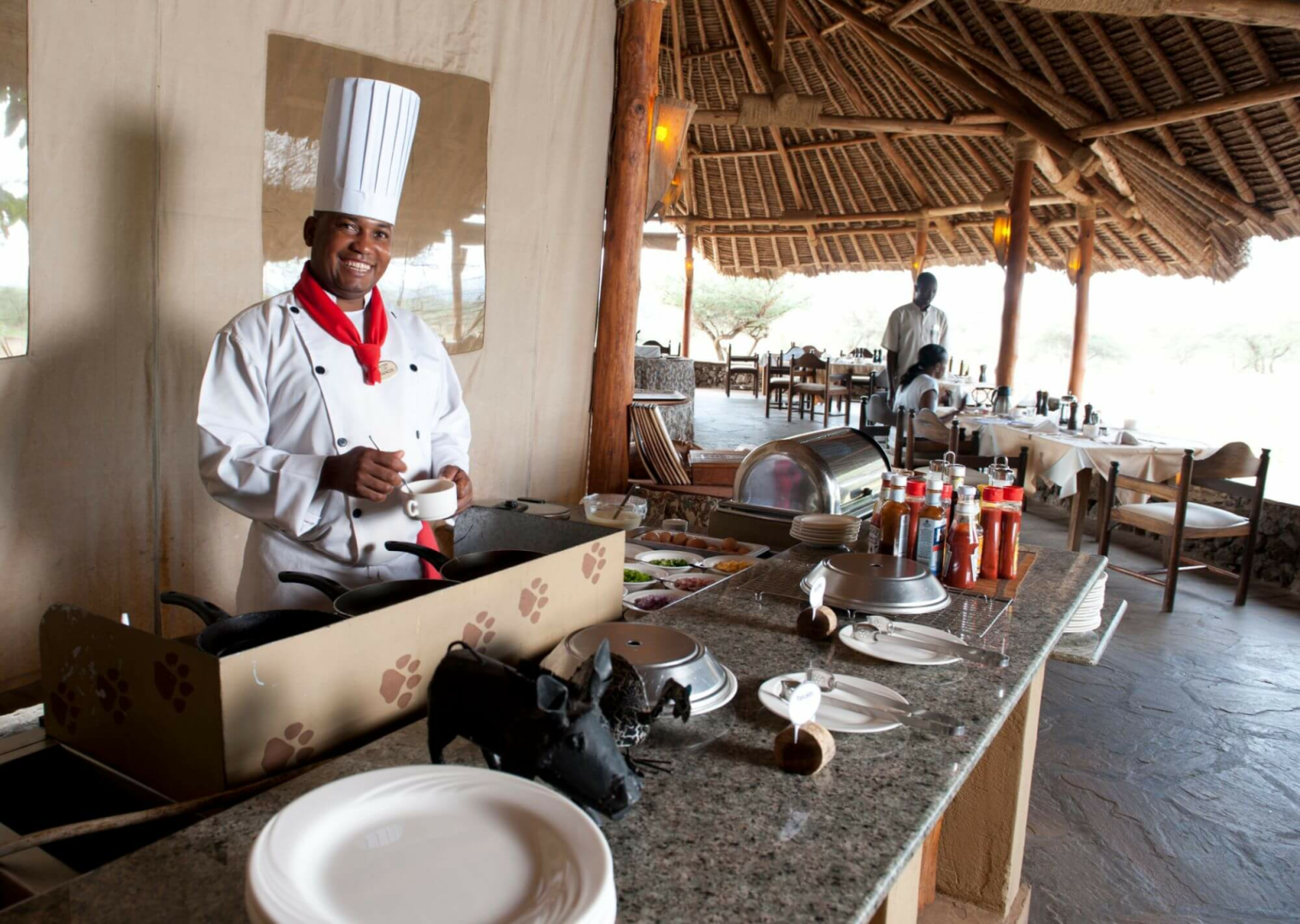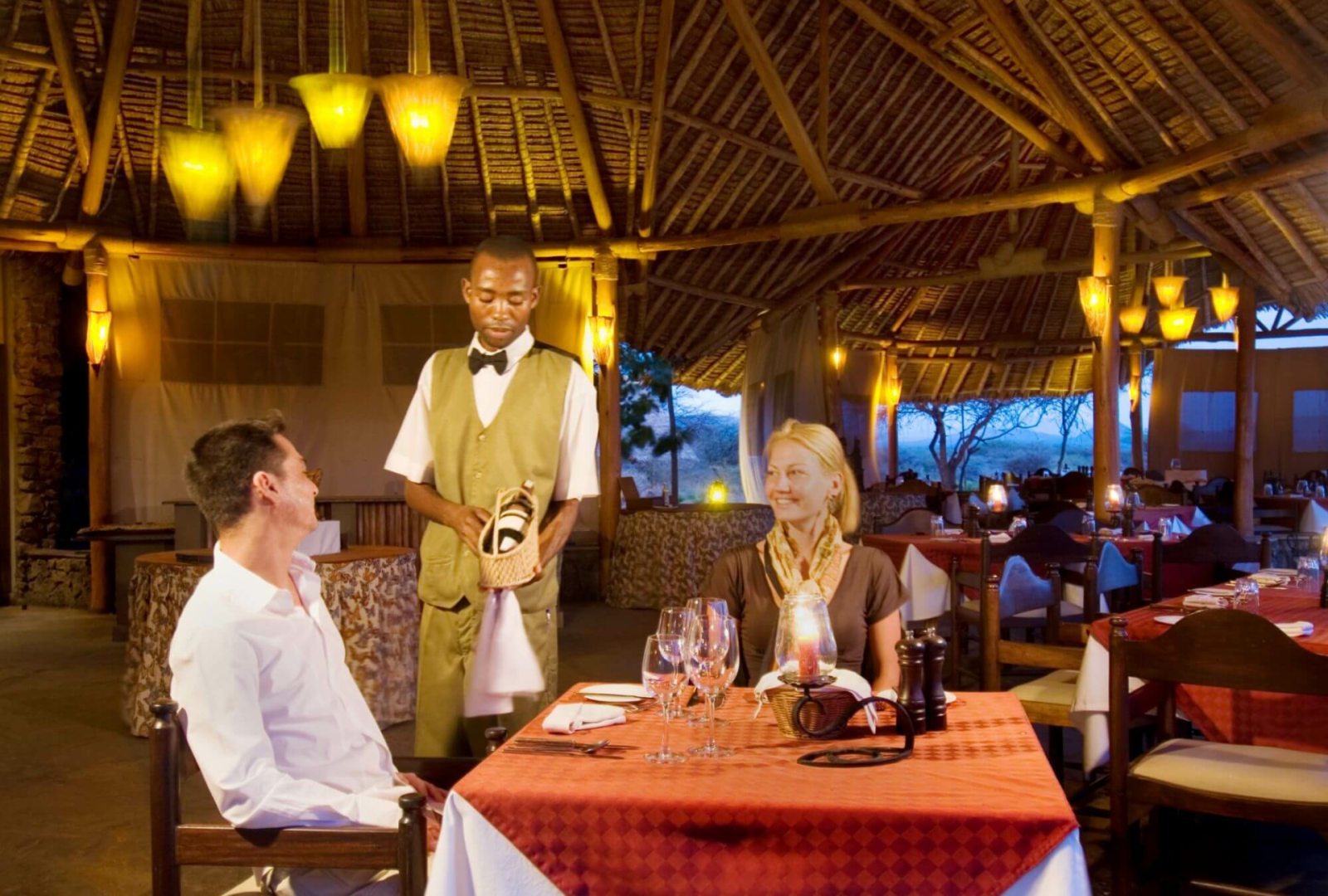 Das offene Hauptgebäude unter Reetdach, das zu einem runden Lagerfeuerplatz führt, ist sehr afrikanisch eingerichtet. Hier befinden sich der gemütliche Lounge- und auch der Restaurantbereich, der im Stil einer überdeckten Terrasse mit Ausblick auf die immer wildreiche Savanne konzipiert wurde. Und dieser Tierreichtum ist der größte Pluspunkt von Severin Camp und auch der Grund seiner großen Beliebtheit. Während fast alle Tsavo-West-Lodges erhöhte Positionen einnehmen, wovon man einen spektakulären Blick auf die Landschaft hat, punktet Severin mit einer Lage komplett mittendrin! Die Tiere sind praktisch überall und man braucht das Camp nicht zu verlassen, um großartige Begegnungen mit der afrikanischen Fauna zu machen. Von den öffentlichen Bereichen und auch von den Zelten bestaunt man einen scheinbar nicht endenden Aufmarsch von Warzenschweinen, Giraffen und Antilopen auf ihren Weg zu den Wasserstellen der Umgebung.