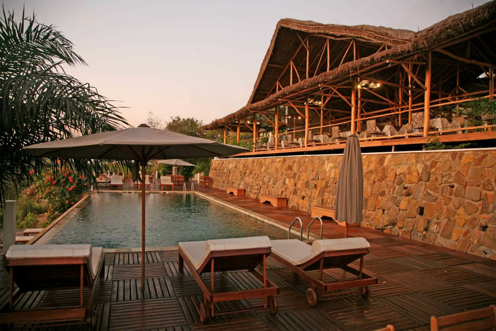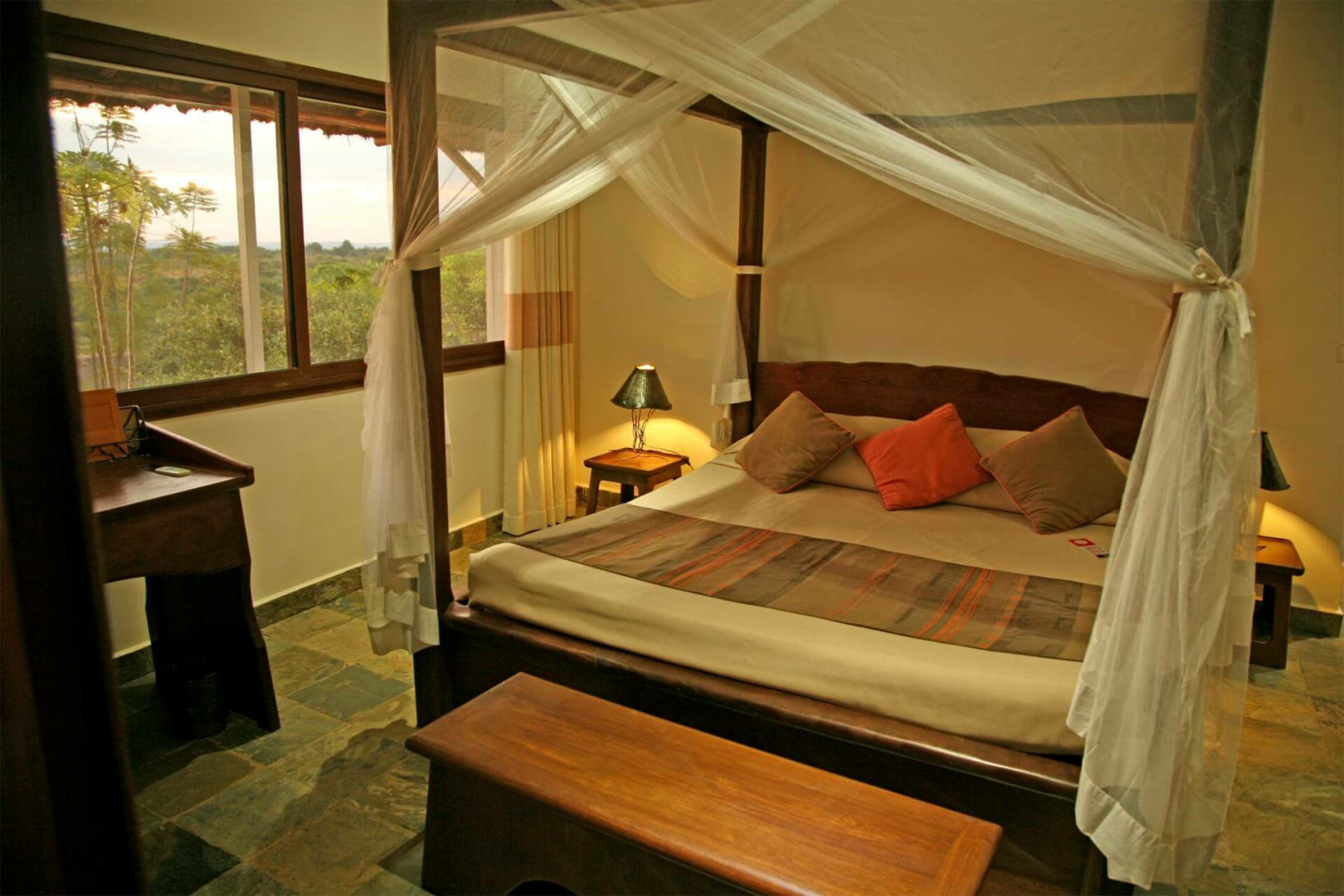 Angenehmes, relativ neues Hotel auf einem markanten Felsvorsprung im Tsingy de Bemaraha Nationalpark. Die Unterbringung erfolgt in 17 geräumigen und hübsch eingerichteten Bungalows, die sich von einem entspannten zentralen Bereich mit Blick auf die Konzession ausbreiten. Das Bett hat ein Moskitonetz, es gibt einen Schreibtisch, ein Sofa, ein Ventilator, WLAN, Safe. Alle Bungalows sind klimatisiert. Das Badezimmer ist mit einer Regendusche und mit großen Waschbecken aus versteinertem Holz ausgestattet. Es gibt vor jedem Bungalow eine private Terrasse, wovon aus man den spektakulären Blick auf das darunter liegende Tal genießen kann.