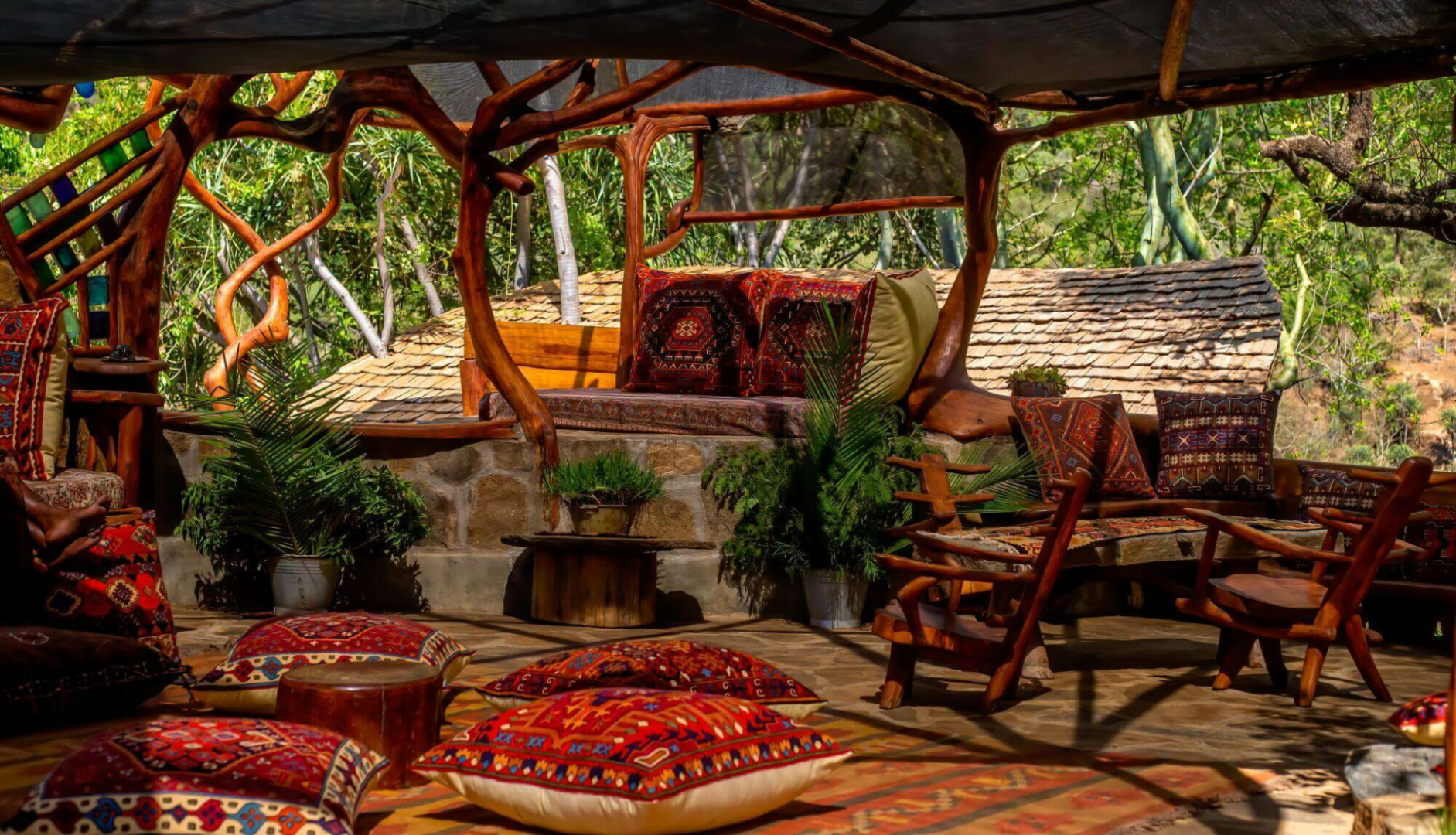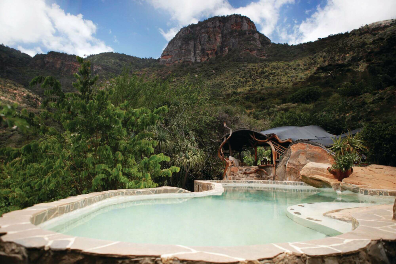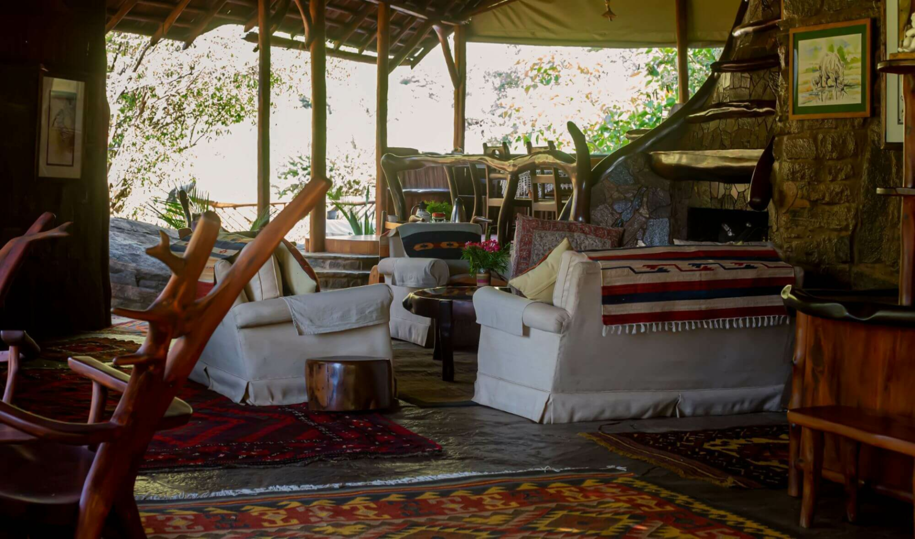 Bei der Ankunft wird man von der herzlichen Gastfreundlichkeit der Nord-Kenianer begrüßt. So stehen das in kaltes Wasser eingetauchte Tuch und ein kühles Getränk auf einem Tablett bereit. Die Hauptlodge unter Reetdach erreicht man über eine kleine breite Steintreppe. Vor der Lodge öffnet sich eine sehr einladende Außenterrasse, wunderbar mit großen traditionellen Teppichen, unzähligen Sitzkissen aus buntem Stoff und Topfpflanzen ausgestattet. Das Deck ist ein wunderbarer Ort, um Vögel zu beobachten. Abends wird vor oder nach dem Abendessen ein Lagerfeuer angemacht. Es gibt zudem einen wunderbaren blauen Pool mit Blick auf die üppige Gebirgsvegetation.