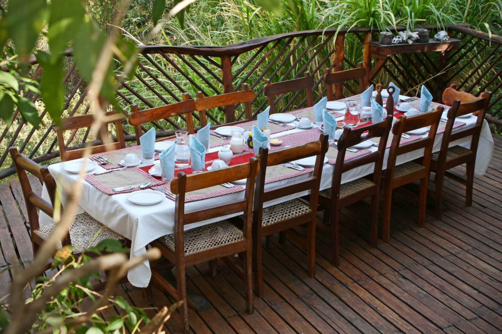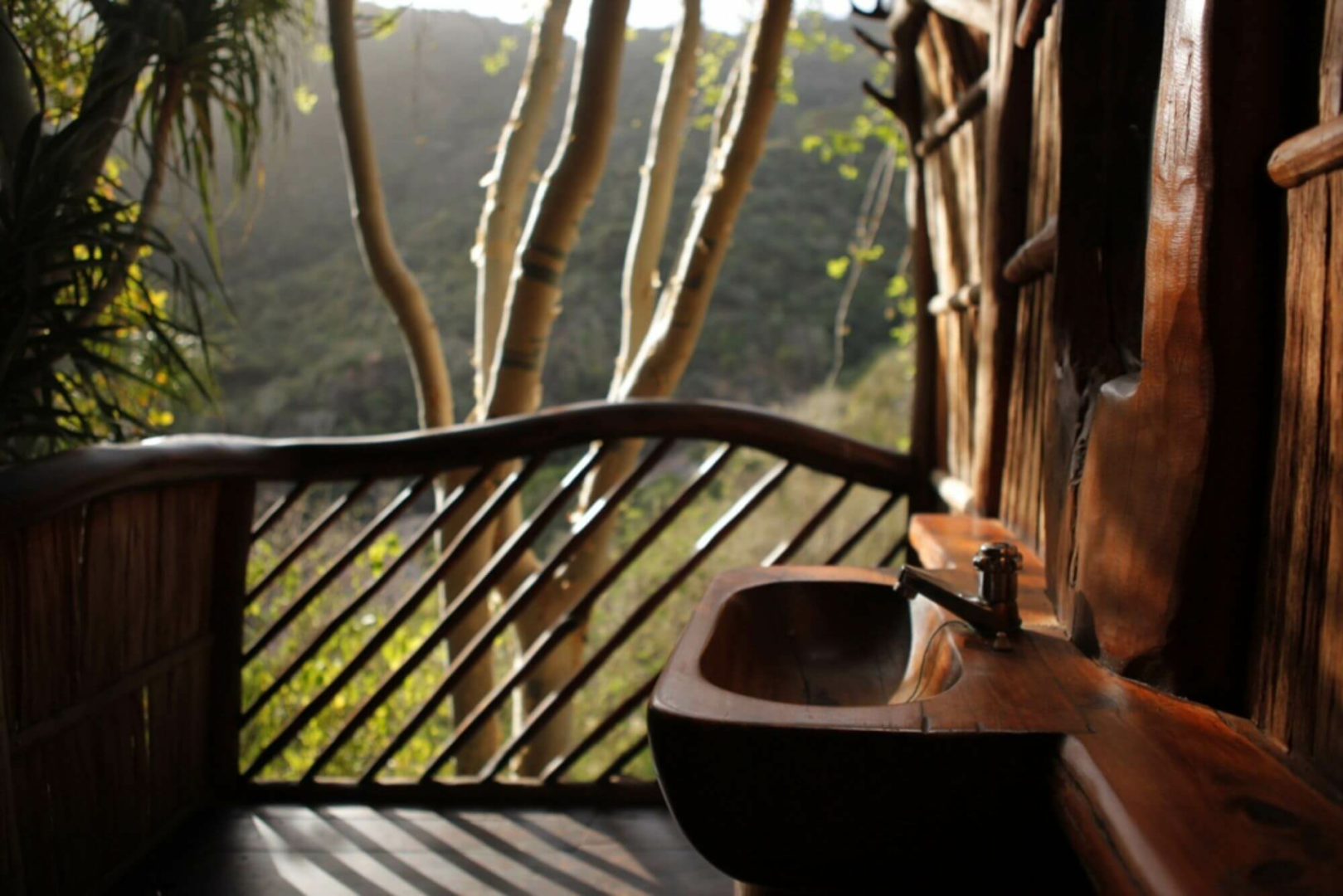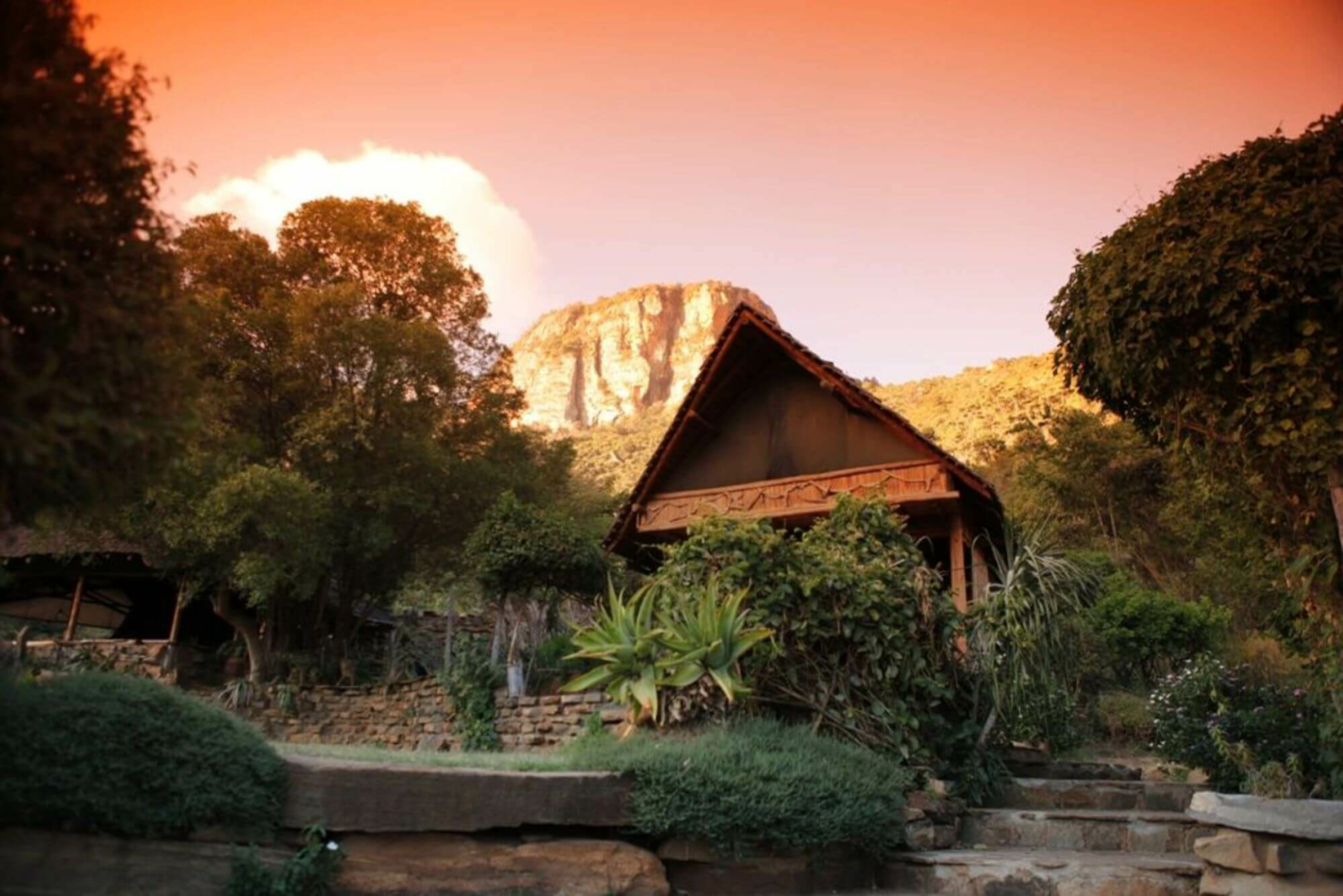 Bei der Ankunft wird man von der herzlichen Gastfreundlichkeit der Nord-Kenianer begrüßt. So stehen das in kaltes Wasser eingetauchte Tuch und ein kühles Getränk auf einem Tablett bereit. Die Hauptlodge unter Reetdach erreicht man über eine kleine breite Steintreppe. Vor der Lodge öffnet sich eine sehr einladende Außenterrasse, wunderbar mit großen traditionellen Teppichen, unzähligen Sitzkissen aus buntem Stoff und Topfpflanzen ausgestattet. Das Deck ist ein wunderbarer Ort, um Vögel zu beobachten. Abends wird vor oder nach dem Abendessen ein Lagerfeuer angemacht. Es gibt zudem einen wunderbaren blauen Pool mit Blick auf die üppige Gebirgsvegetation.