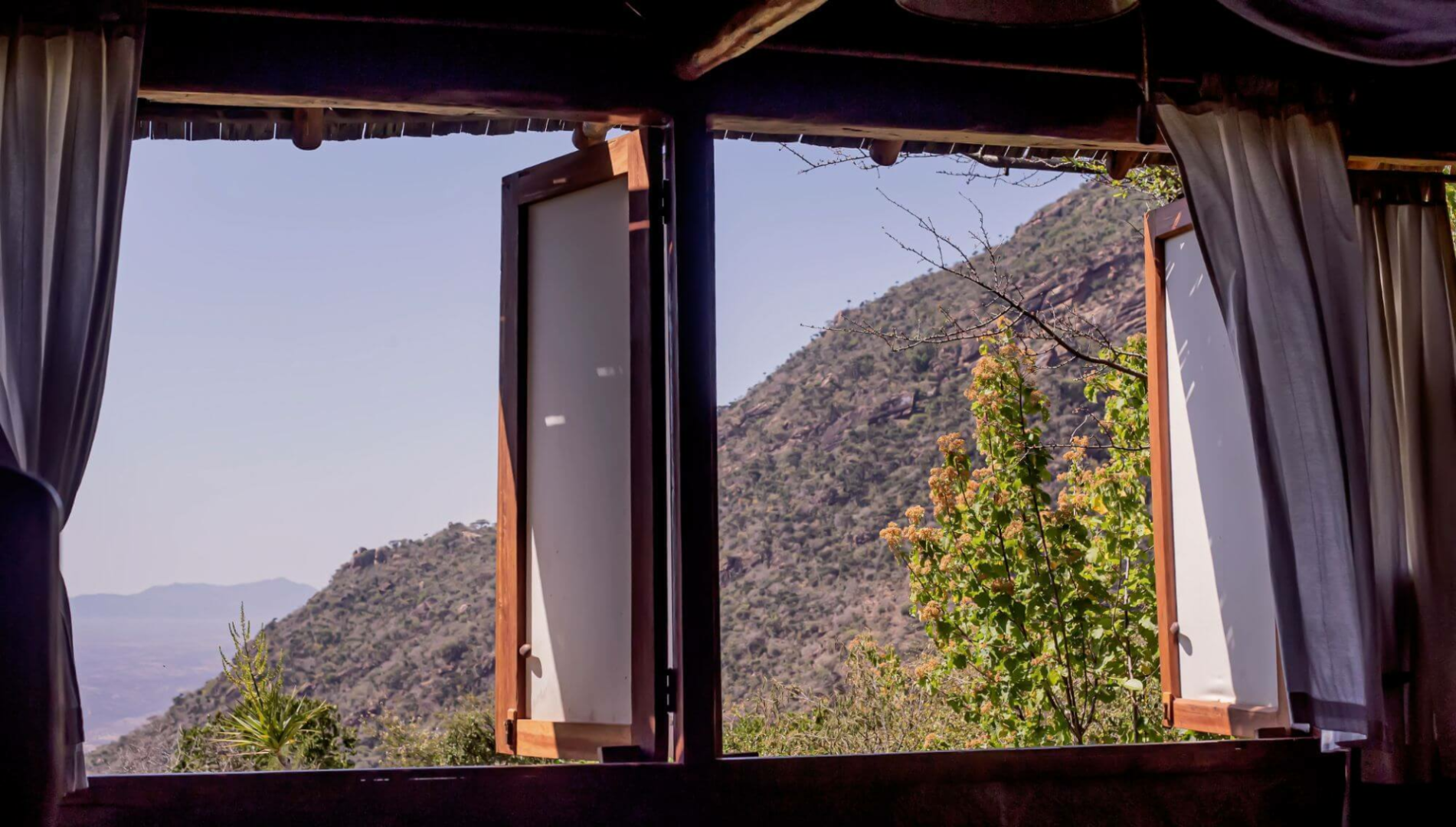 Die meisten Besucher kommen mit einem Hubschrauber hierher. Von der Landebahn fährt man mit einem Allradwagen vorbei an einem einsamen Dorf und entlang einer schwindelerregenden Straße, die immer wieder unglaubliche Blicke auf die fantastische Landschaft bietet. Vor der Lodge öffnet sich eine große grüne Wiese mit fabelhaftem Blick auf die steilen Berghänge des Mount Nyiru. Vom auf der Rückseite gelegenen Beobachtungsdeck blickt man auf die imposante Gipfelkulisse des Berges mit seinen üppig bewachsenen Felsen aus Kalkstein.