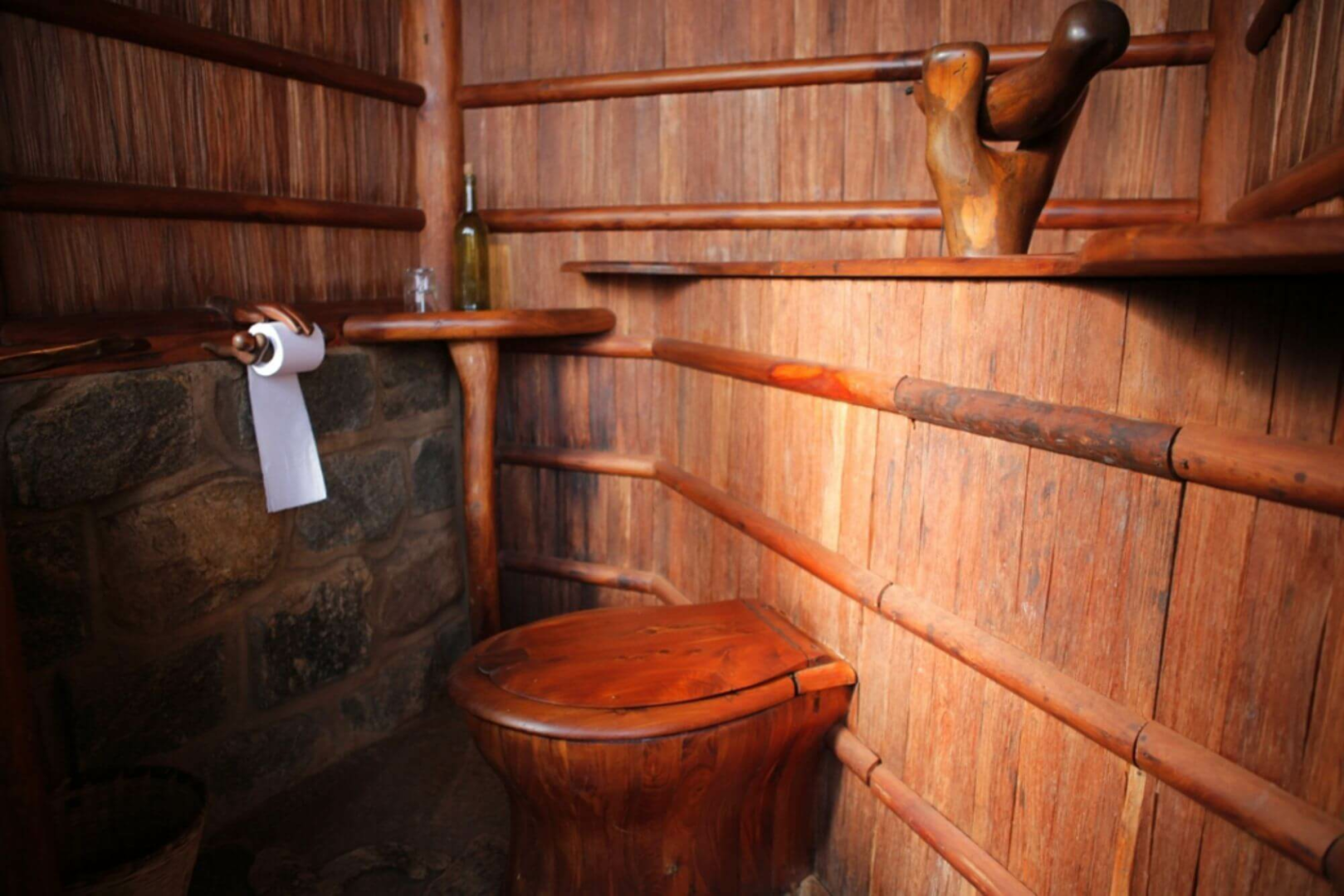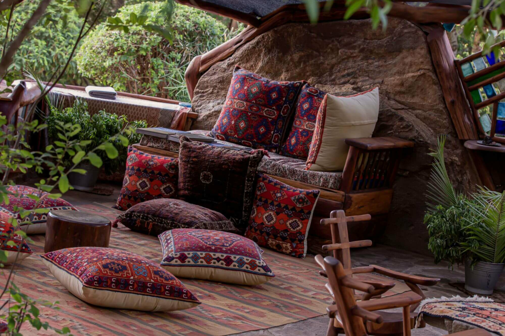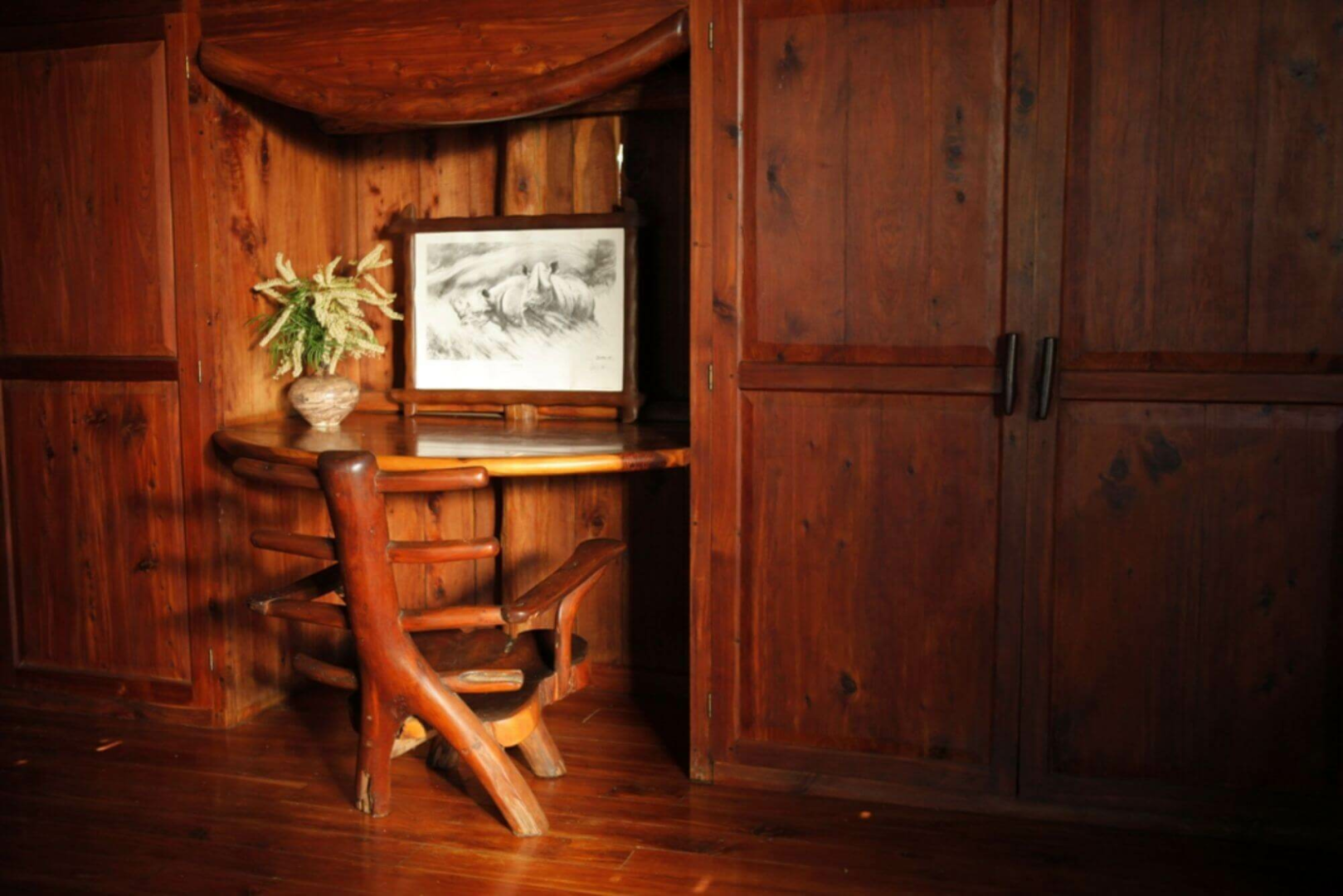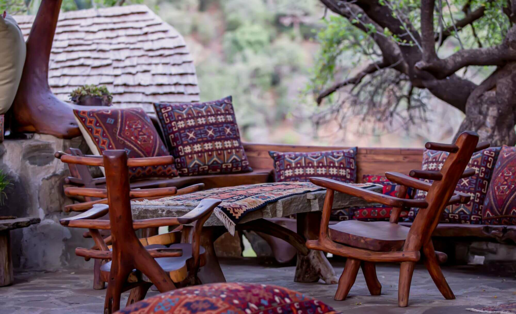 Im Inneren ist die Lodge sehr gemütlich mit Steinwänden, einem Kamin, cremefarbigen Polstersofas, originellen handgefertigten Stühlen aus dunklem Edelholz, einem Tagesbett und einem Bücherregal eingerichtet. Die liebe zum Detail ist in der Lodge unglaublich präsent. Ein Tisch für die gemeinsamen Mahlzeiten steht draußen.