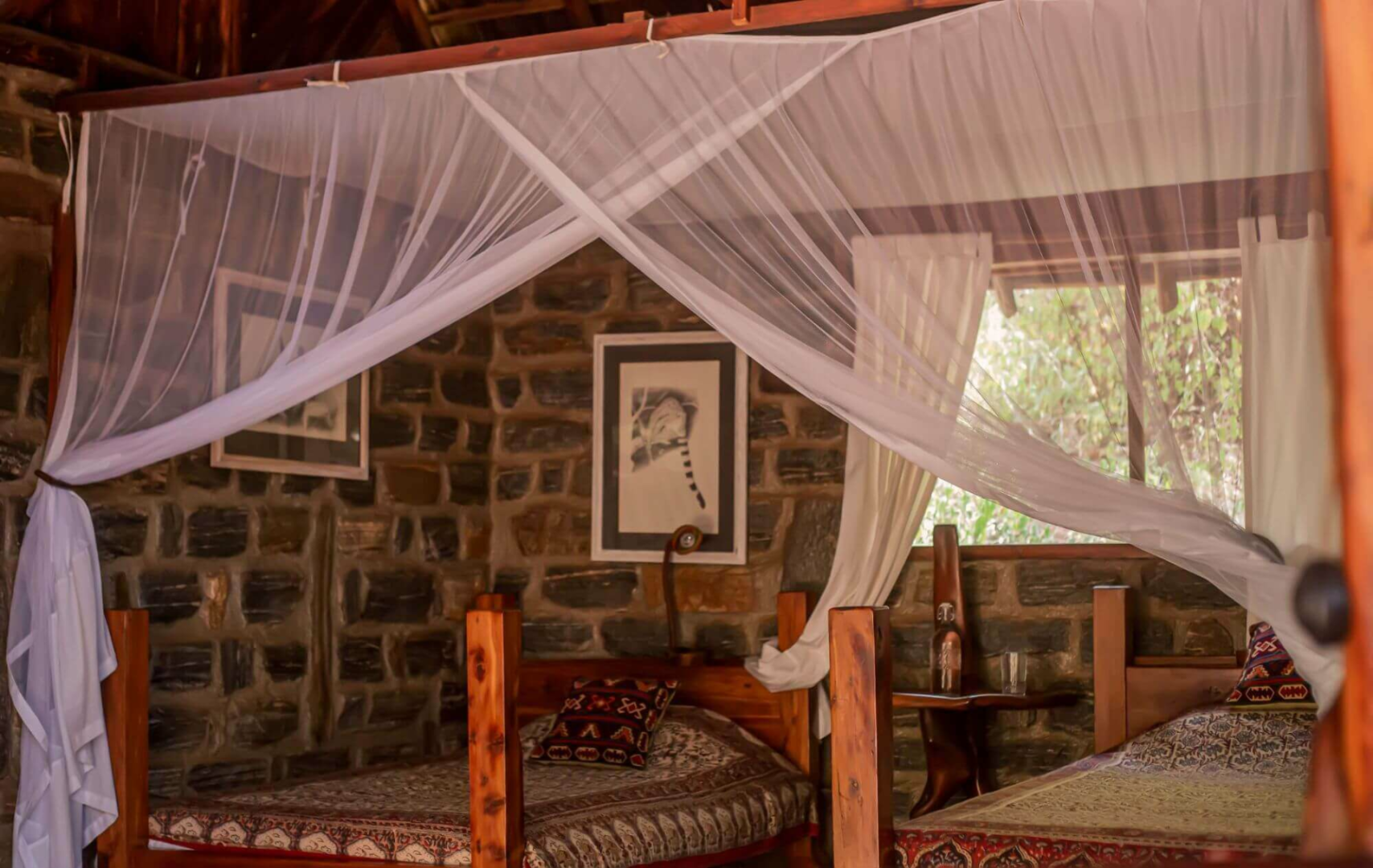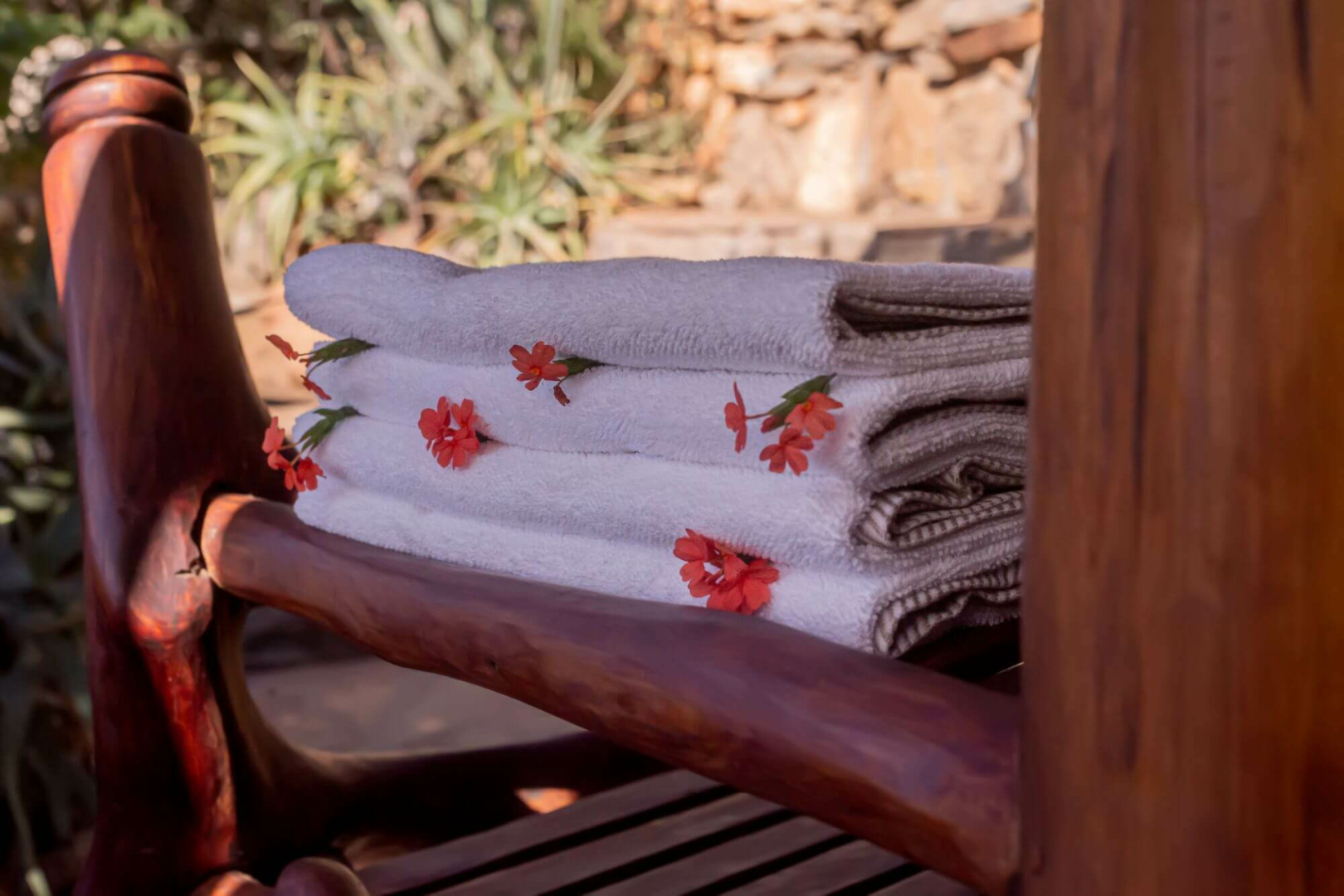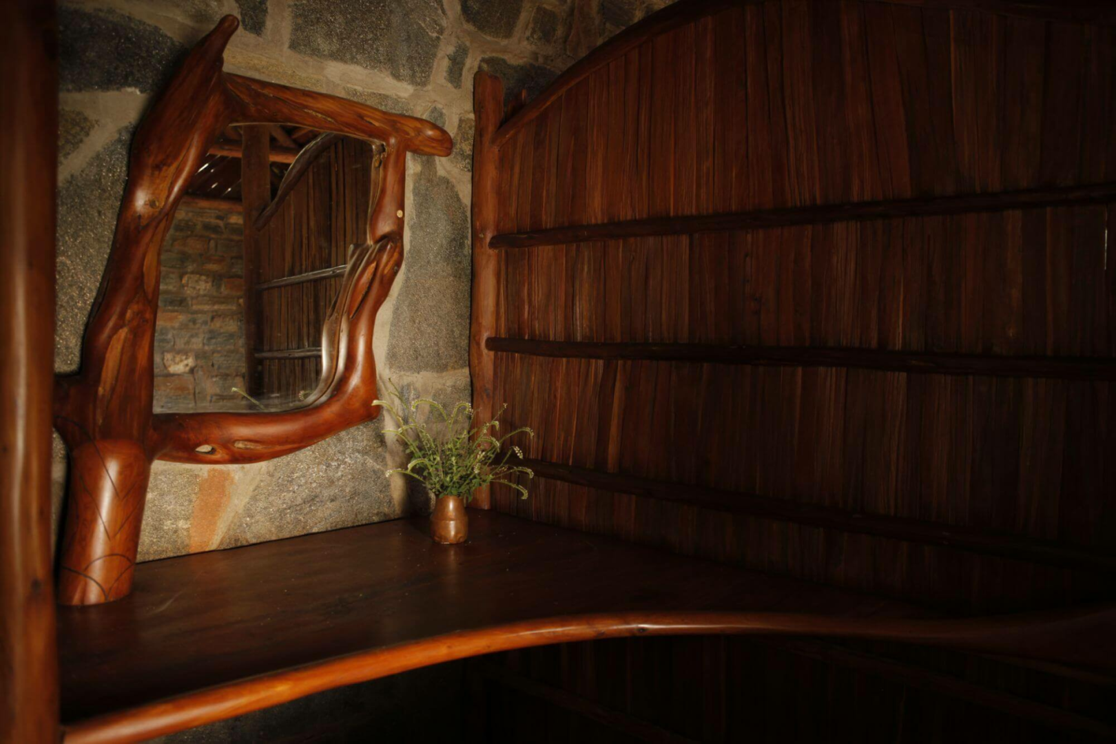 Die Gäste werden in sechs liebevollen Cottages untergebracht, die zum Teil eine offene Bauweise aufweisen, um die kühlende natürliche Brise hereinzulassen. Die Cottages sind vollständig aus lokalem Stein gebaut, auch die inneren Wände wurden nicht verputzt, um so für einen rustikalen Akzent zu sorgen. Alle Möbel wurden handgefertigt. Besonders originell sind die Holzschnitzereien, die man überall, sogar im Badezimmer, findet. Letztere sind komplett offen und sehr rustikal mit einer wundervollen Badewanne, welche vollständig aus Holz geschnitten ist.