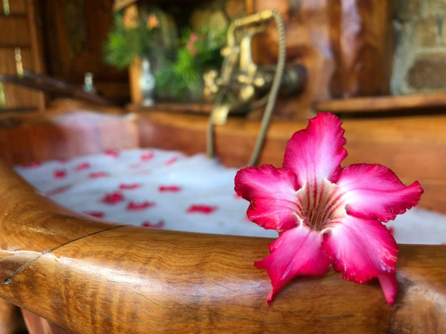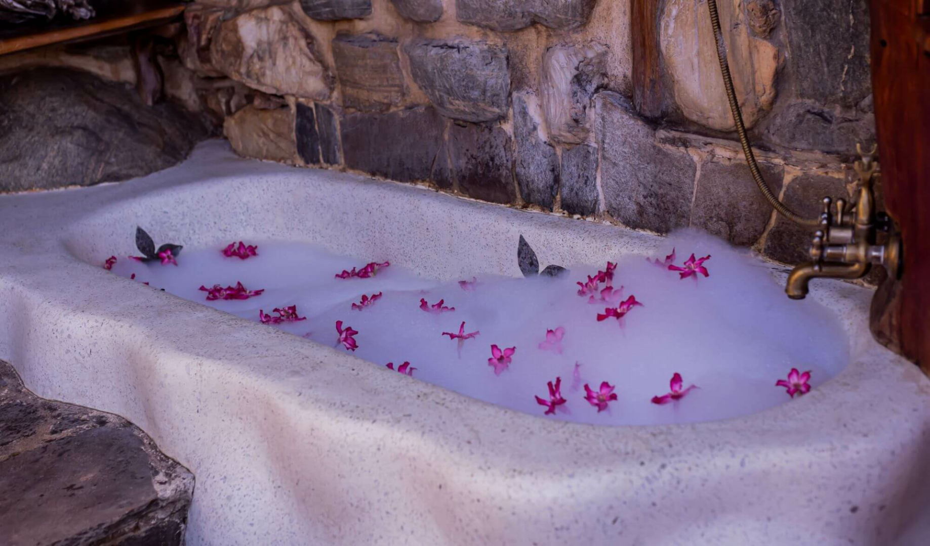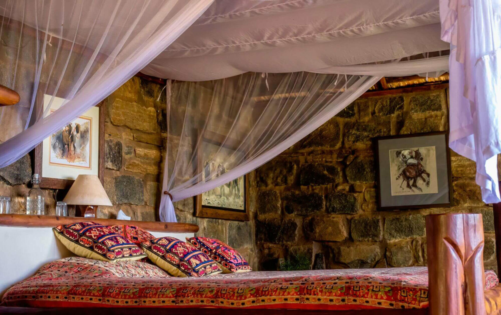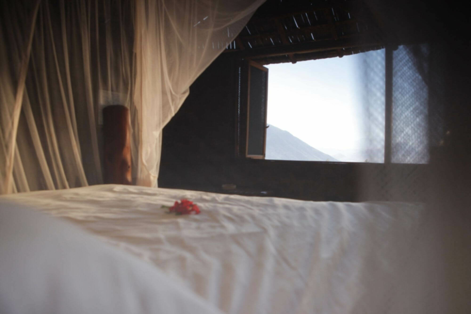 Die Gäste werden in sechs liebevollen Cottages untergebracht, die zum Teil eine offene Bauweise aufweisen, um die kühlende natürliche Brise hereinzulassen. Die Cottages sind vollständig aus lokalem Stein gebaut, auch die inneren Wände wurden nicht verputzt, um so für einen rustikalen Akzent zu sorgen. Alle Möbel wurden handgefertigt. Besonders originell sind die Holzschnitzereien, die man überall, sogar im Badezimmer, findet. Letztere sind komplett offen und sehr rustikal mit einer wundervollen Badewanne, welche vollständig aus Holz geschnitten ist.