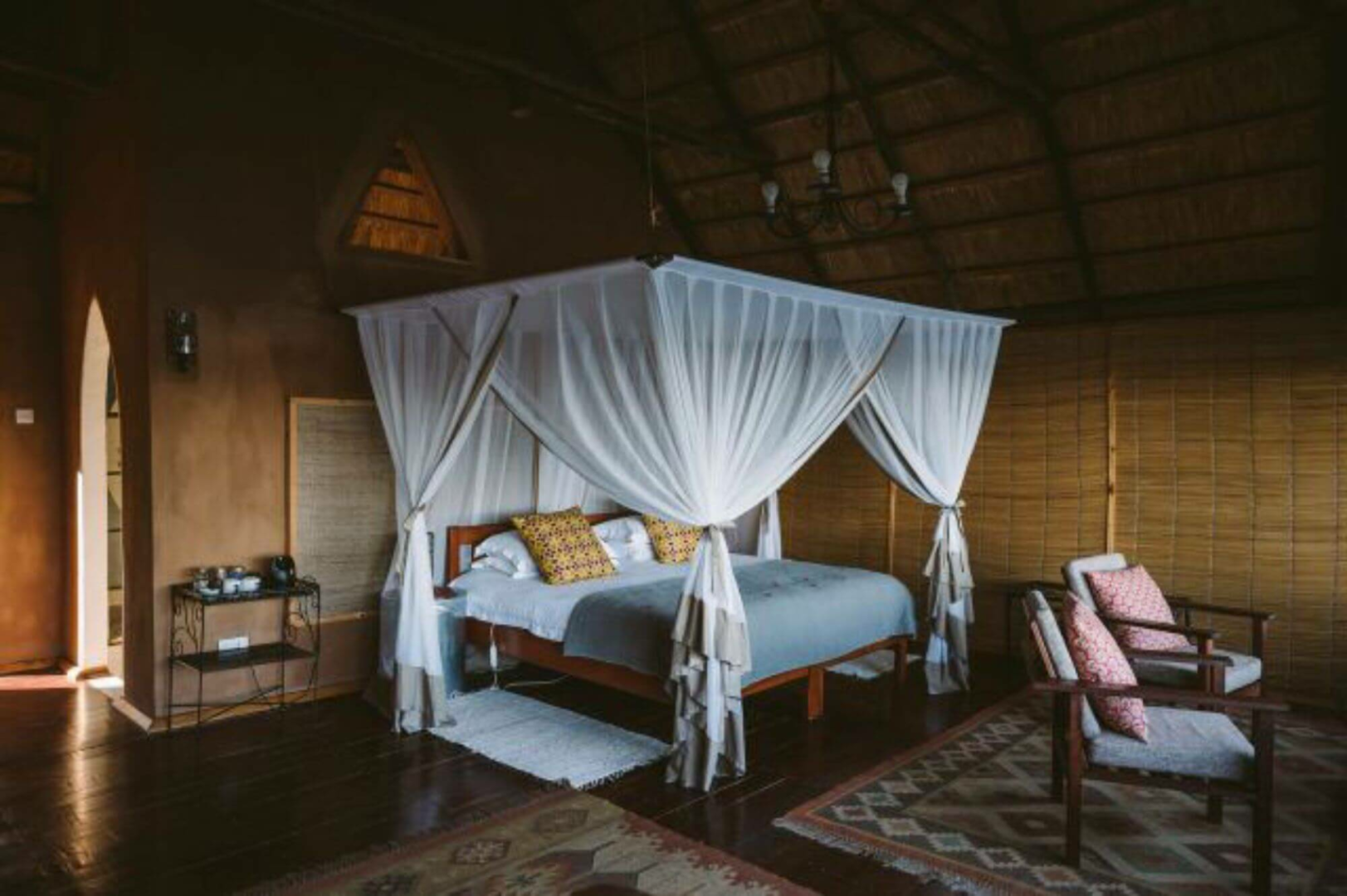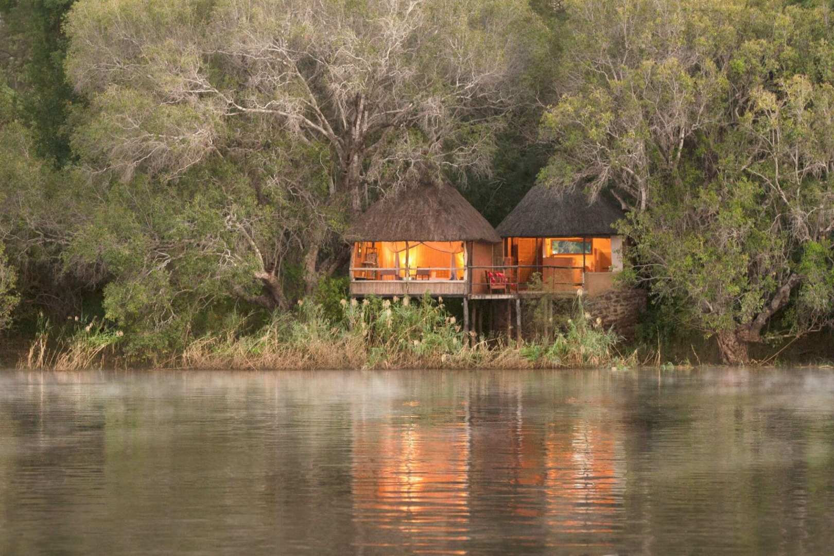 Gäste werden in sechs auf Stelzen gebauten Chalets, die entlang des von Schilf gesäumten Ufers verteilen. Die Chalets weisen eine offene Bauweise auf, mit einer auf den Fluss offenen Wandseite, die einen schönen Panoramablick ermöglicht. Im Inneren sind die Schlafzimmer komfortabel, die Badezimmer sind völlig ausgestattet, aber können etwas dunkel wirken.