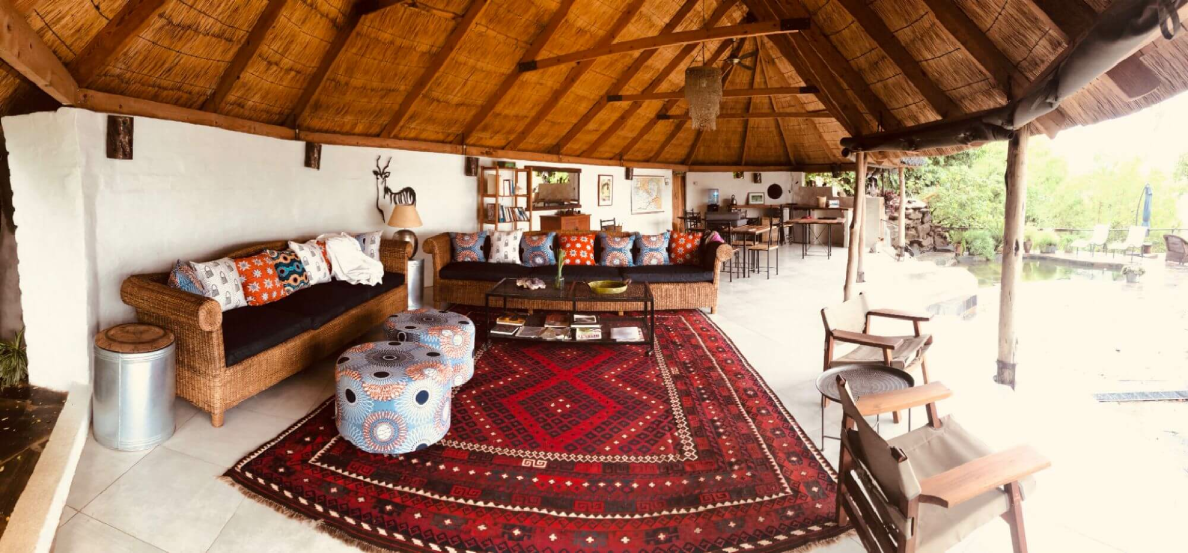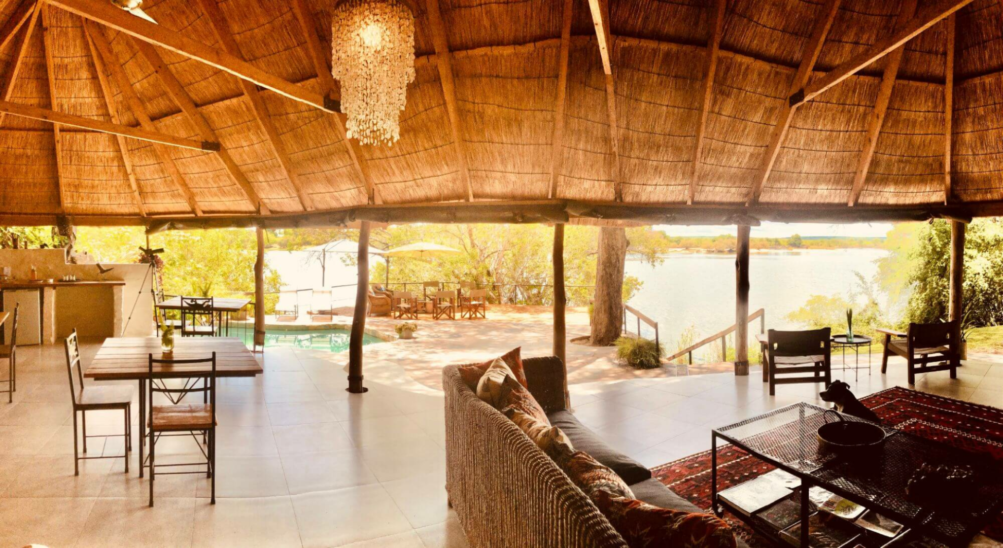 Herz der Lodge ist eine unter Reetdach stehende Boma mit simpel eingerichtetem Loungebereich und einer komplett auf den Fluss hin offene Seite mit Steindecke, einigen Esstischen und einem kleinen Pool.
