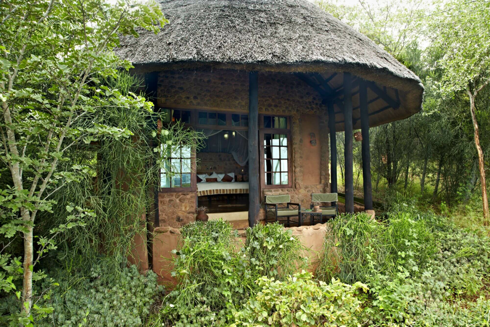 Die Lodge besitzt zehn Cottages, die man über sandige Wege erreicht. Fünf Cottages haben ein halb offenes Badezimmer, das wirklich gut gelungen ist und großartige Ausblicke über die Savanne von der frei stehenden Badewanne aus ermöglicht. Auch die Bauweise der Cottages ist offen, mit einer halb offenen Vorderseite von man aus in die Landschaft blicken kann. Im Inneren sind die Zimmer typischem Safaristil eingerichtet, mit Polsterbetten, Böden aus dunklem Holz, Schreibtisch und Gepäckablage. Alle Cottages haben eine große Terrasse. Die anderen fünf Cottages sind etwas luxuriösere Suites und wurde traditioneller gebaut (also ohne vordere offene Seite.)