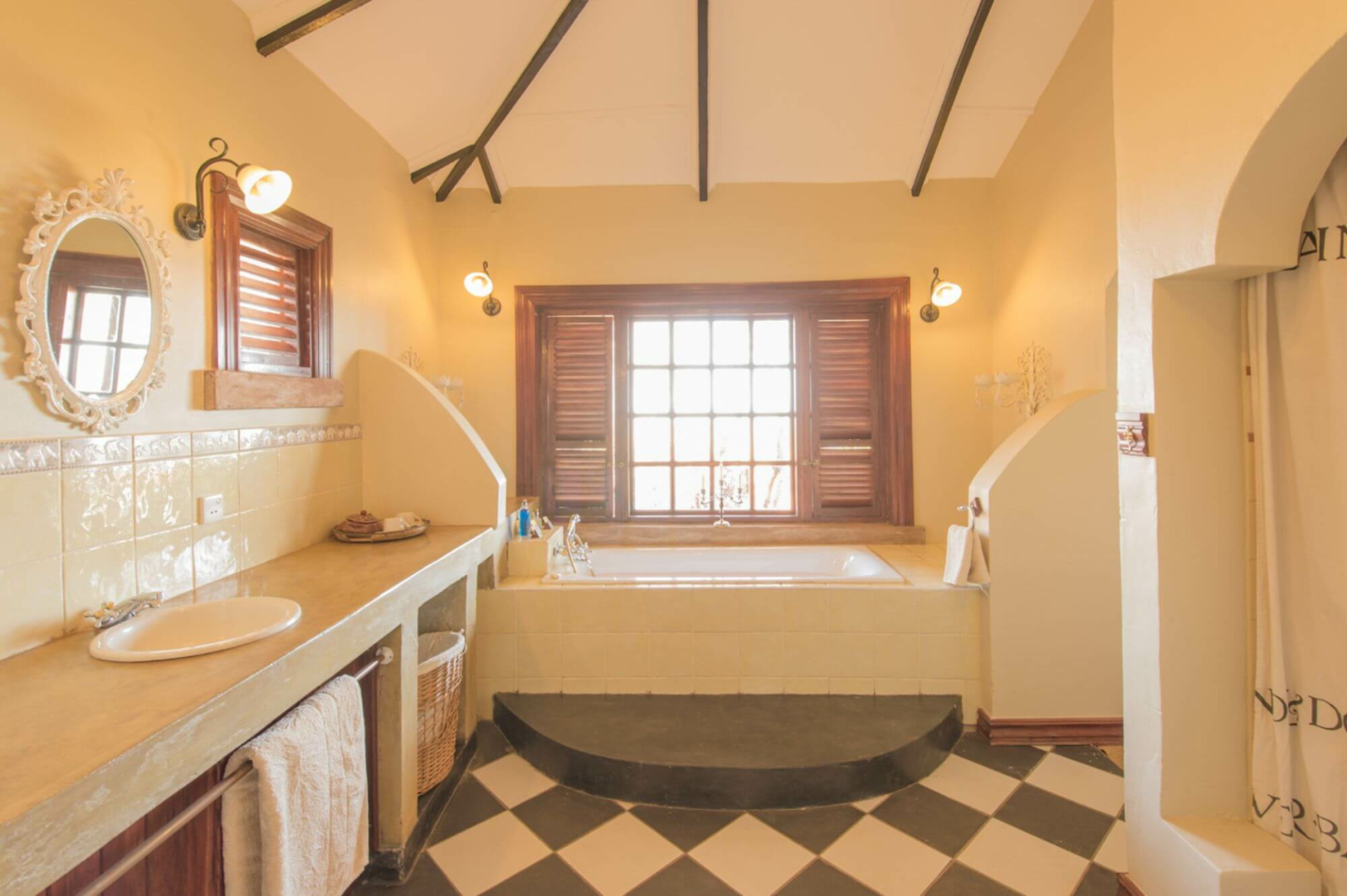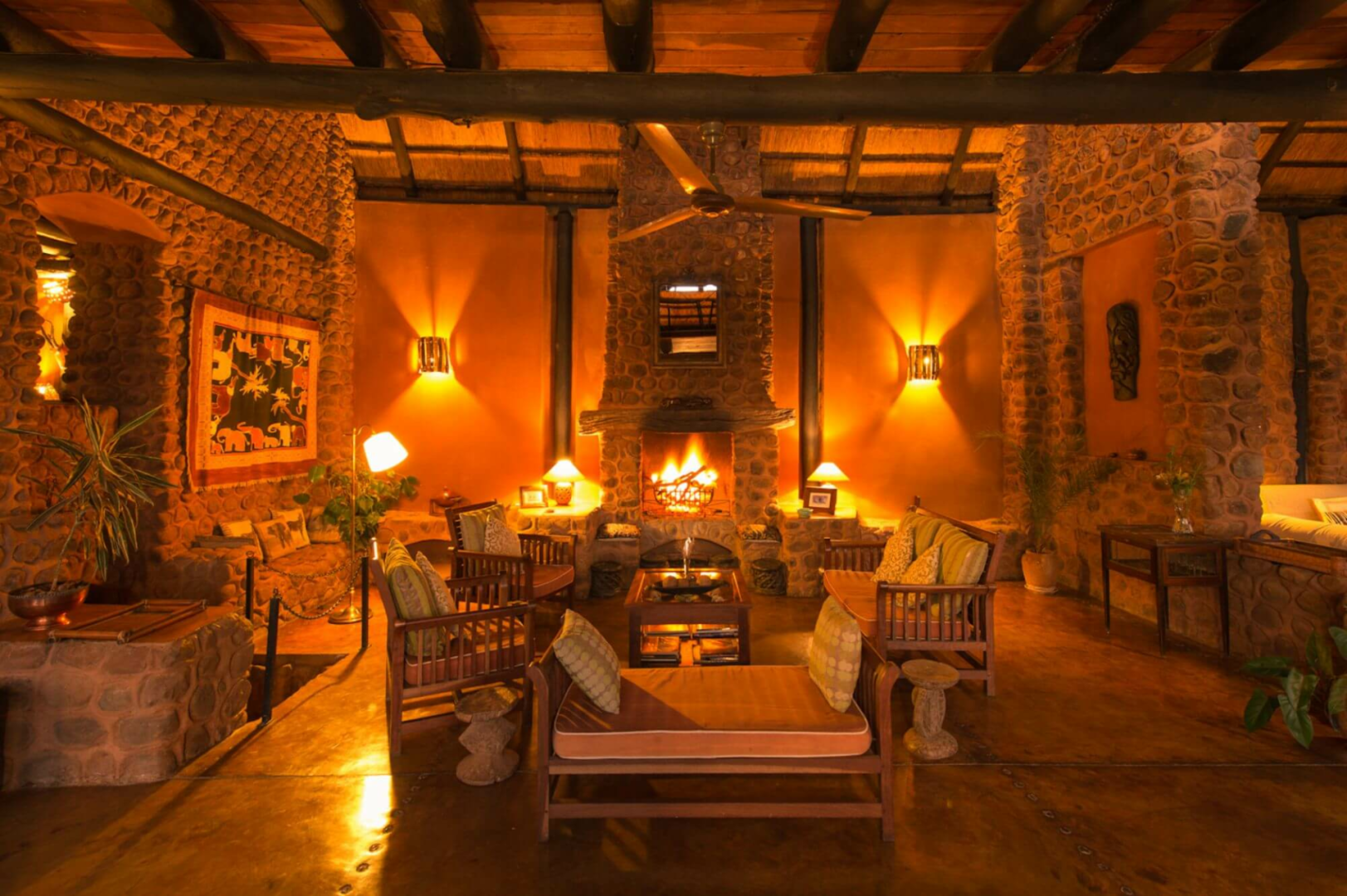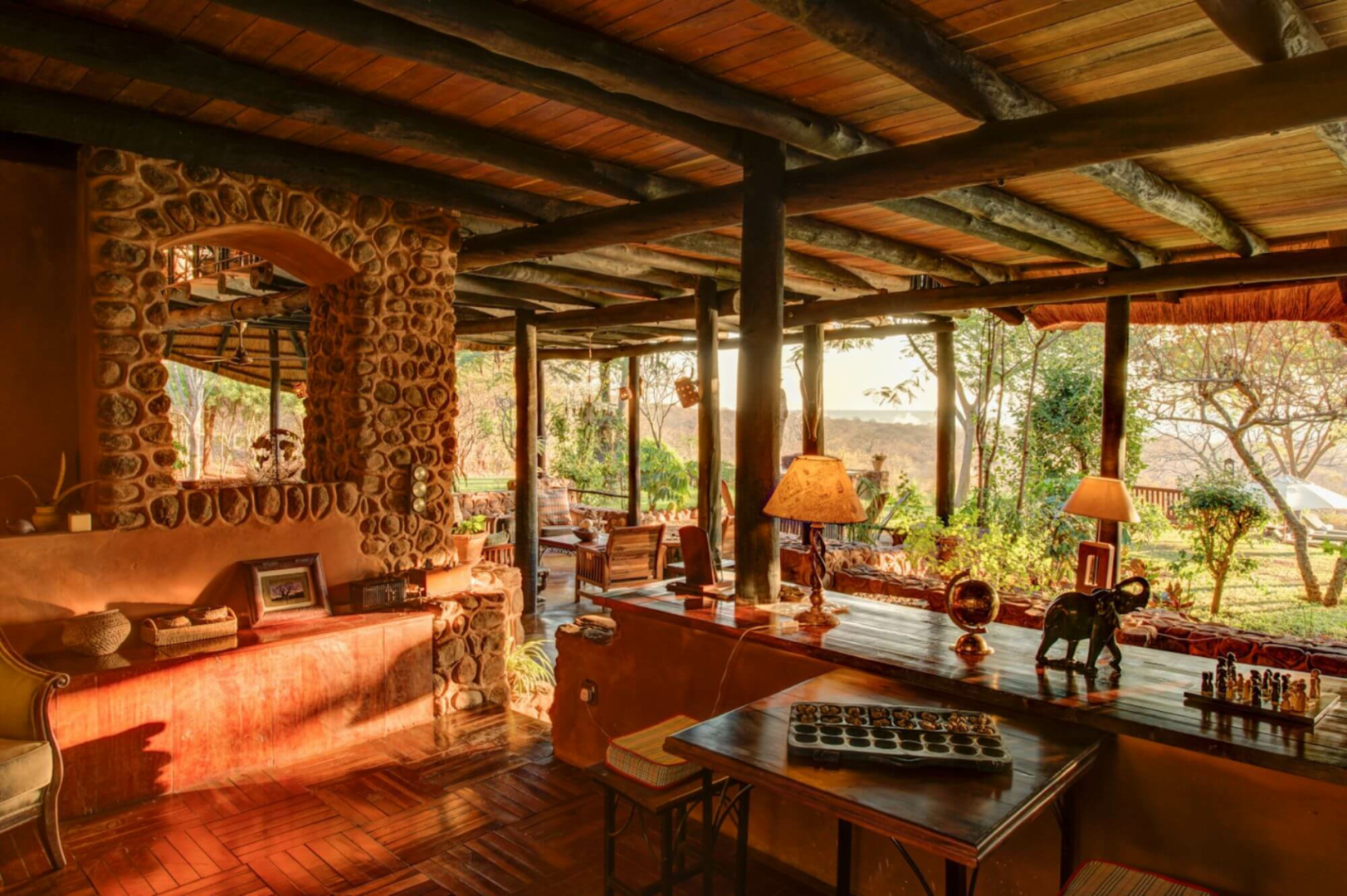 Herzstück der Lodge ist ein zweistöckiges typisches Safarihaus unter Reetdach. Ein farbenfroher großer gemeinsamer Aufenthaltsbereich mit vielen bunten Kissen, hohen Decken, gestützt von Pfählen aus dunklem Holz, und urigen Sitzbänken aus Stein lädt zur Entspannung an. Es gibt auch eine Bibliothek und ein Oberdeck. Draußen bietet der Infinity-Pool einen schönen Blick auf den Sonnenuntergang und auf den Busch. Der Busch um die Lodge ist sehr tierreich, um ungewollte Begegnungen mit Elefanten zu verhindern, wurde ein Elektrozaun um die Lodge angelegt.