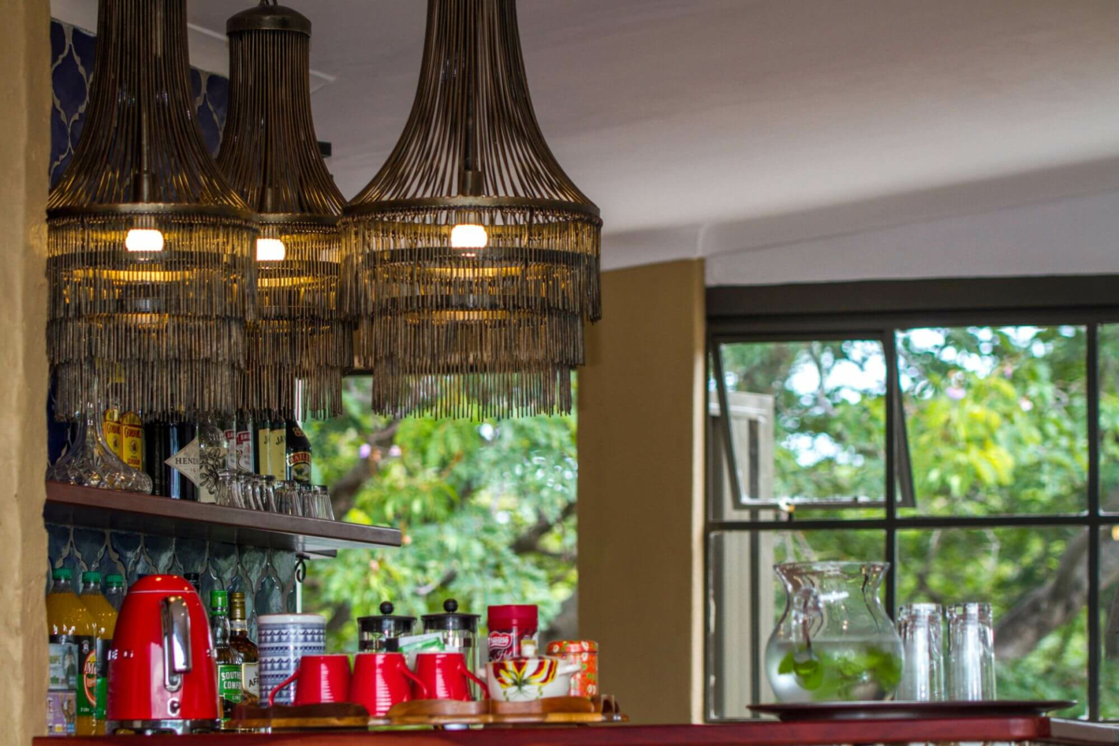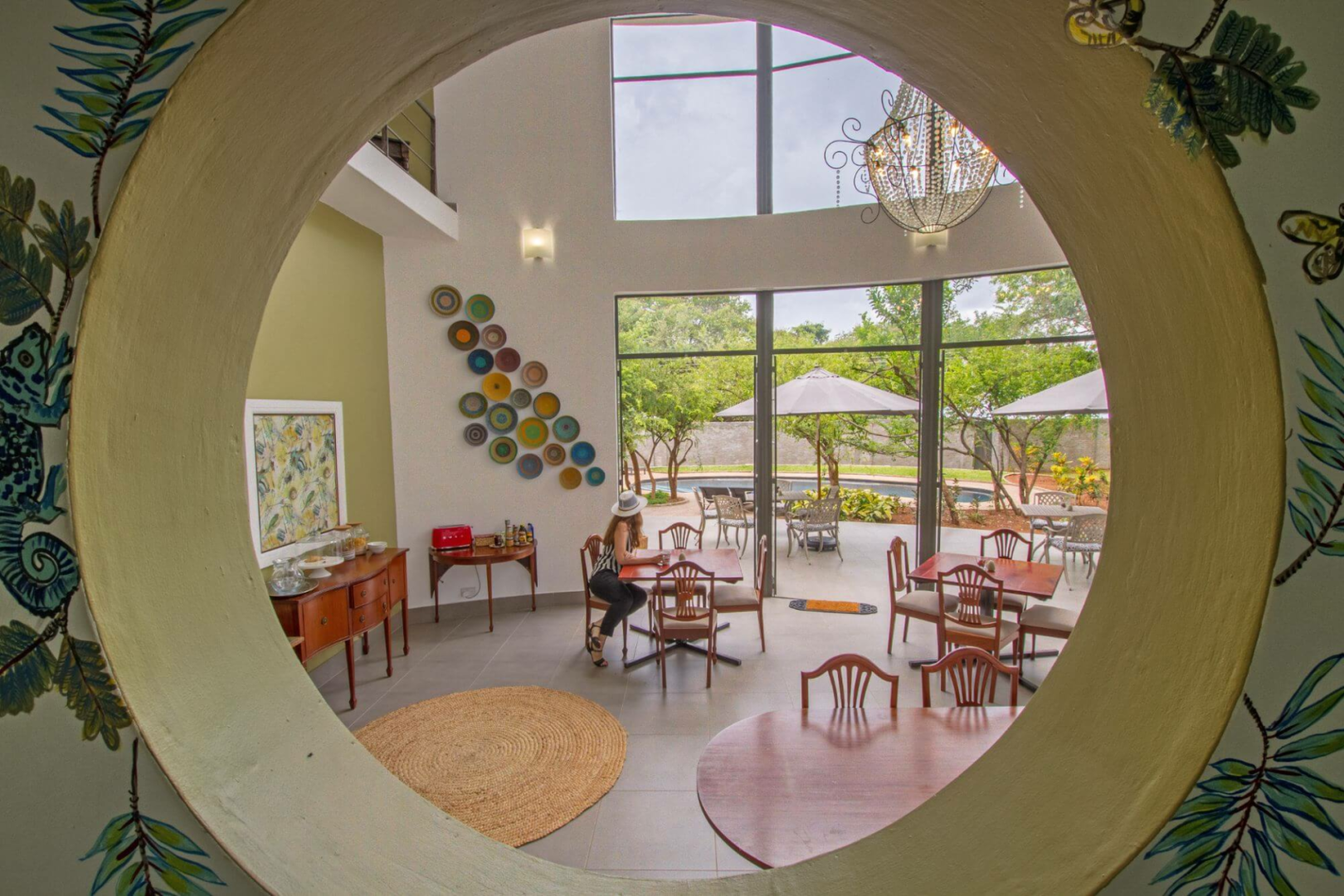 Das Hotel ist in einem ultramodernen mehrstöckigen Haus mitten im Wald untergebracht, das im Inneren ein einzigartiges Design mit Elementen aus lokalen Kunsthandwerkern aufweist. Wandschnitzereien, Wandmalereien, nach Maß angefertigte Kronleuchter, bunte Textilien, Designermöbelstücken schmücken die hellen Räumlichkeiten. Im Erdgeschoss befindet sich ein riesiges Restaurant im Loftstil mit fantastischen Panoramafenstern. Oben befindet sich das „Treetops“, eine Dachbar wovon es sich ein spektakulärer Blick auf den Sambesi öffnet.
