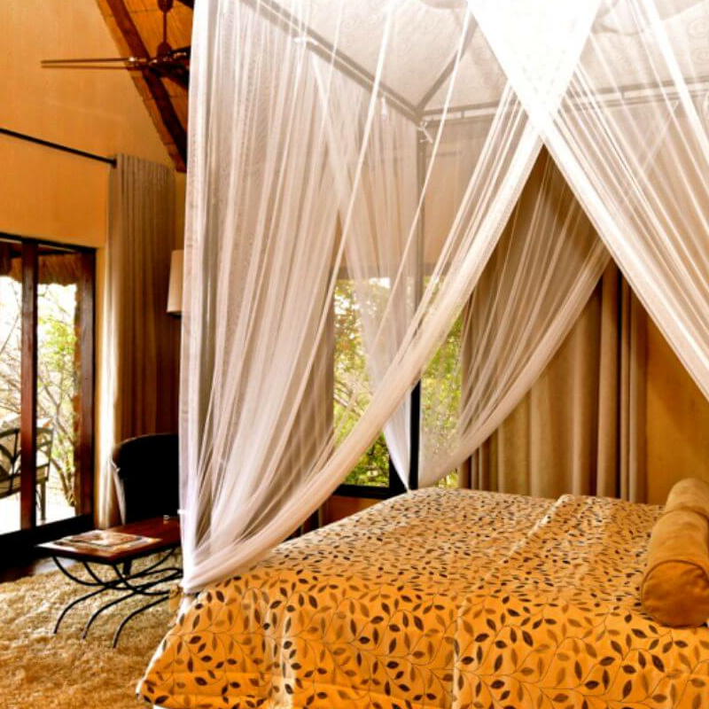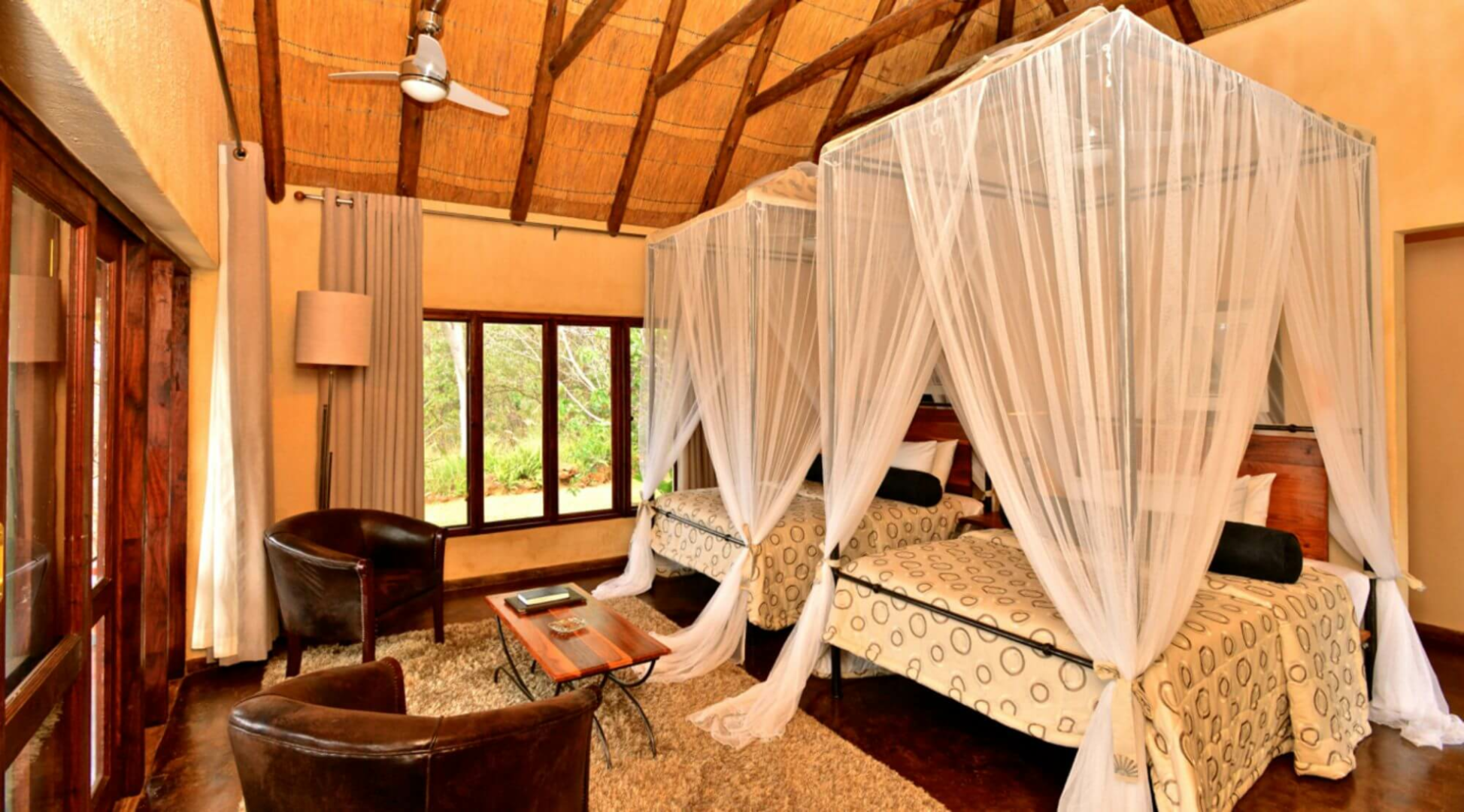Gäste werden in zehn schönen reetgedeckten Chalets jeder mit ausgezeichnetem Aussichten. Die Chalets liegen am Rande der Schlucht, dem Sonnenaufgang zugewandt, und haben alle eine phänomenale Aussicht von ihren privaten Balkonen mit einem Stuhl und einem Tagesbett. Die Inneneinrichtung ist sehr gemütlich und komfortable. Verputzte Böden, cremefarbige Wände, das Reetdach, ein flaumiger Teppich, ein paar Ledersessel und schöne Stehlampen verleihen dem Raum eine urgemütliche Wohlfühlatmosphäre.