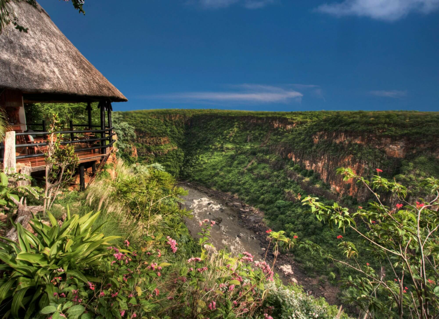 Die 10 km flussabwärts der Victoriafälle am Rande der Batoka-Schlucht atemberaubend gelegene Gorge Lodge durfte mit Blick auf den 200 Meter tiefer fließenden Sambesi mit dem spektakulärsten Blick in ganz Afrika pochen.