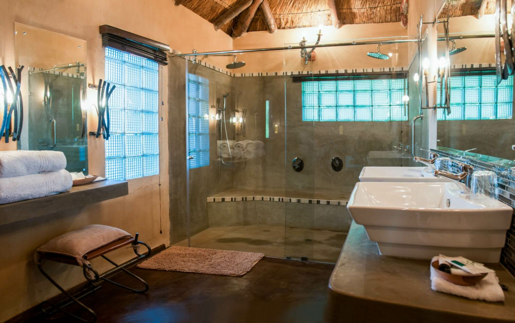 Die Hauptlodge, ein Steinhaus unter Strohdach mit Bar, Lounge und Restaurant, ist einfach aber urgemütlich eingerichtet und bietet eine spektakuläre Aufsicht auf Dibu-Dibu-Schlucht und den unten fließenden Sambesi.