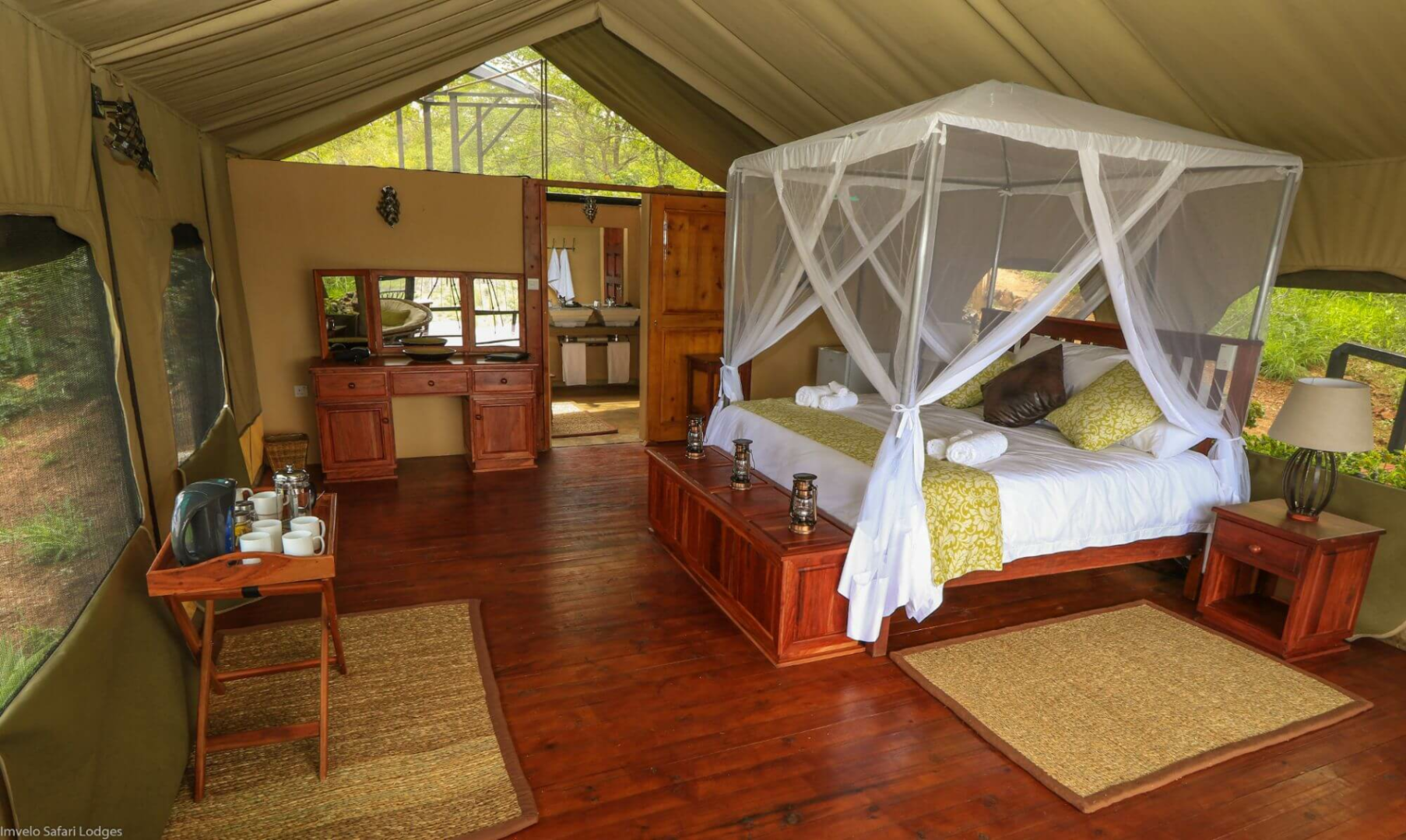 Gäste werden in fünf sehr bequemen und super eingerichteten Luxuszelten mit der gleichen großartigen Aussicht. Vor der privaten Veranda hält man Ausschau auf vorbei fliegende Adler. Im Inneren überraschen die Zelte mit hohen Komfortstandards, Holzboden, schönen Mobiliar aus hellen Massivholz und ein gut ausgestattetes Badezimmer.