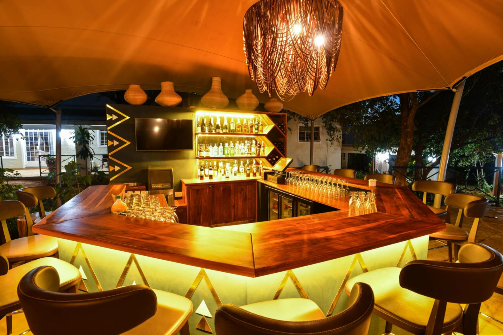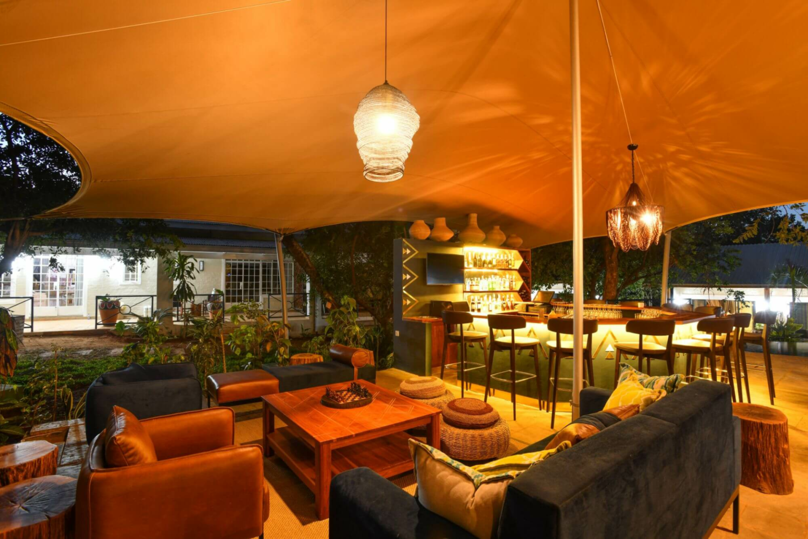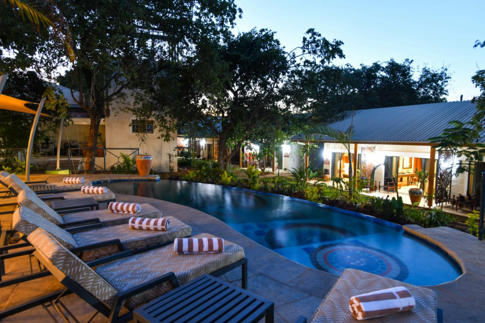 Die Lodge besteht aus einem simplen großen Haus mit Blick auf die Terrasse und den Pool, wo die Zimmer untergebracht sind. Rechts vom Pool wurde ein offener Bereich unter Leinwand aufgestellt, wo es sich eine Feuerstelle, ein offener Restaurantbereich und Sitzmöglichkeiten im Freien befinden. Trotz des kleinen Preisniveaus von Shongwe Lookout ist die Einrichtung bis ins kleinste Detail durchdacht, von den schönen Hängeleuchten, die ein angenehmes Licht ausstrahlen, über die traditionellen Dekorelementen aus Rattan hin zu den eingebauten Keramikmosaiken an Wänden und Töpfen.