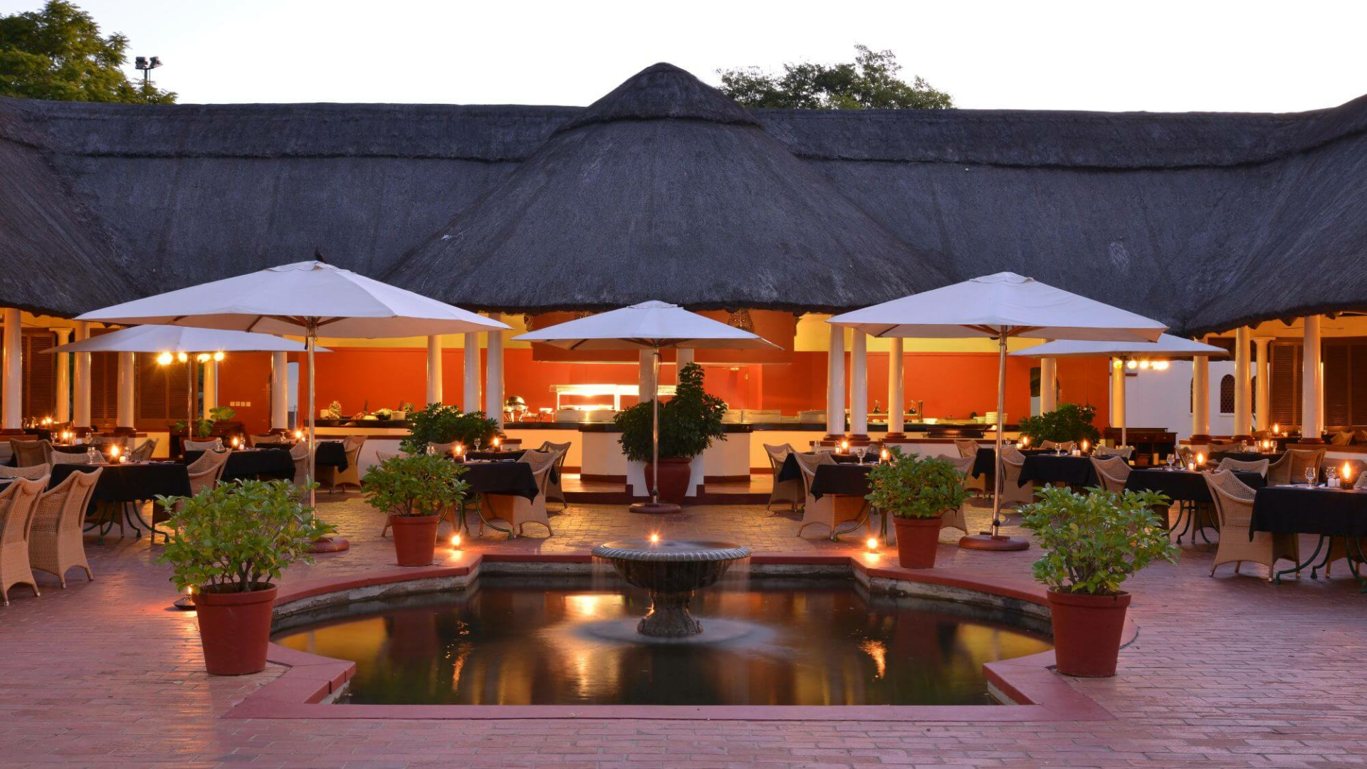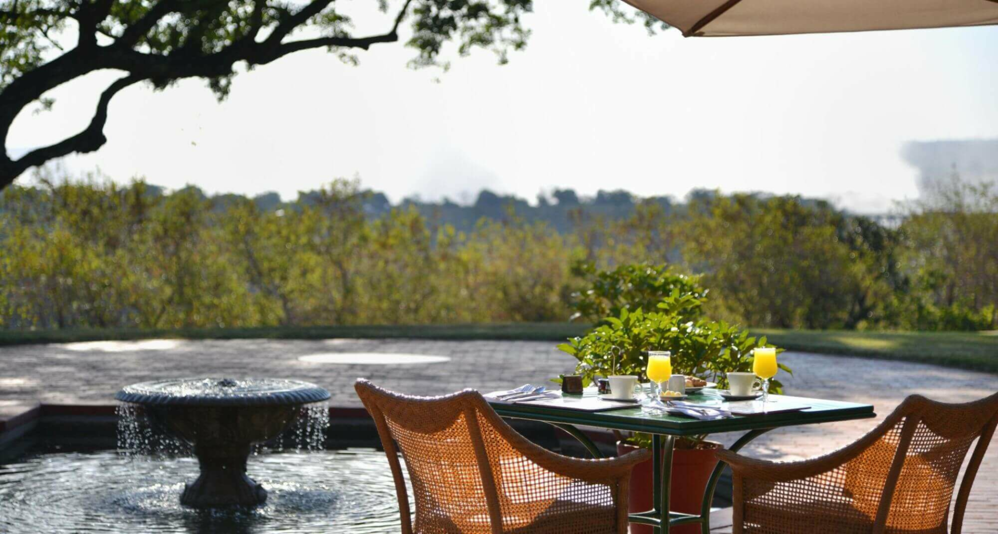 Das Hotel ist um mehrere Innenhöfe angeordnet. Schattenspendende Palmen, ruhige Teiche, ein Kräutergarten, aus denen man Kräuter für die eigene Küche gewinnt, eine alte Straßenbahn, die früher die edlen Hotelgäste zu den Fällen fuhr, eine schicke Cocktailbar, großflächige Terrassen mit Blick auf die Vic Falls: überall findet man Ecken, um die perfekt durchdachte Landschaft mit einem Drink zu genießen.