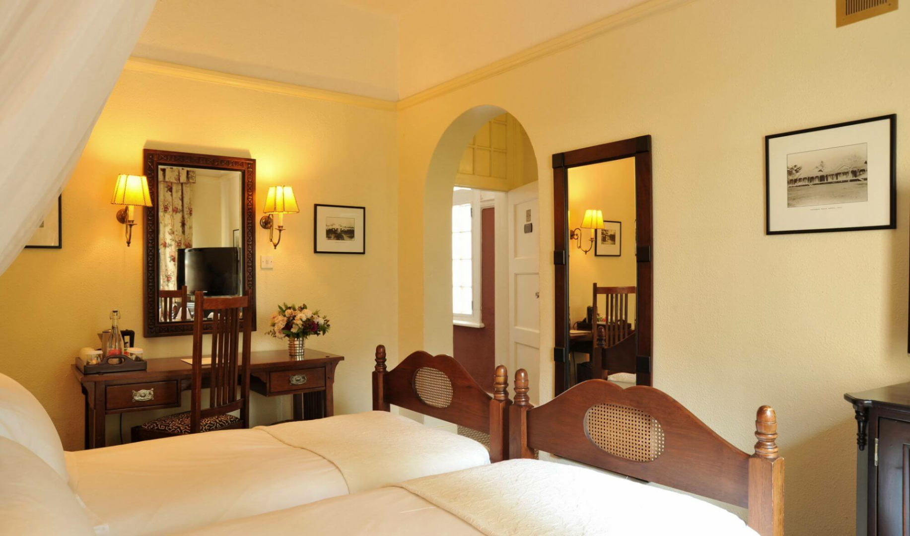 Im Inneren enttäuscht das Hotel mit exquisiten im Kolonialstil eingerichteten Räumlichkeiten nicht. Überall schmucken alte Bilder und Plakate die Wände, die auf die Geschichte des Hauses zurückblicken. Jagdtrophäen, Antiquitäten aus der alten Heimat Großbritannien und wertvolle Erinnerungsstücken aus Afrika ergänzen das Bild. Sämtliche Räume sind sehr luxuriös ausgestattet, ob die Lounge mit riesigen alten Gemälden und Porträts, die Bibliothek mit Kamin und eine Sammlung von Druckarbeiten an der Wand oder der imposante Essraum, in dem noch heute mit dem Untersatz von einem Live-Pianisten wie ein König speisen kann.