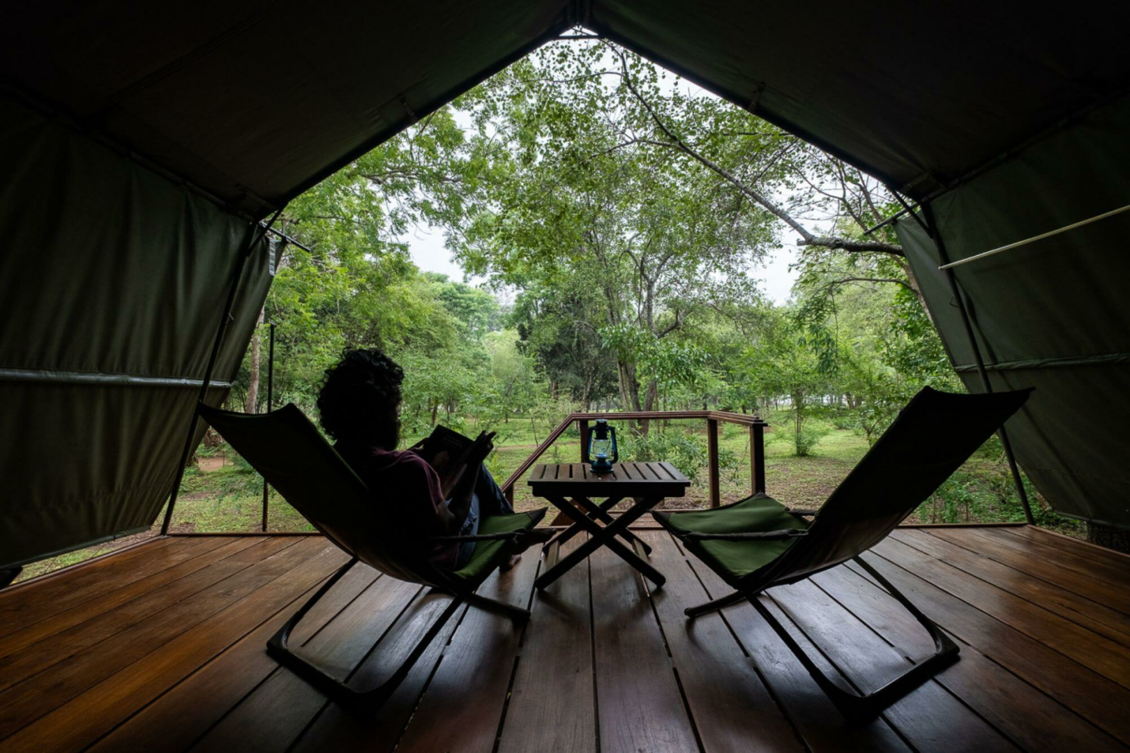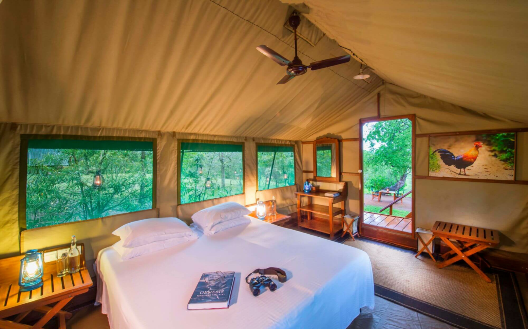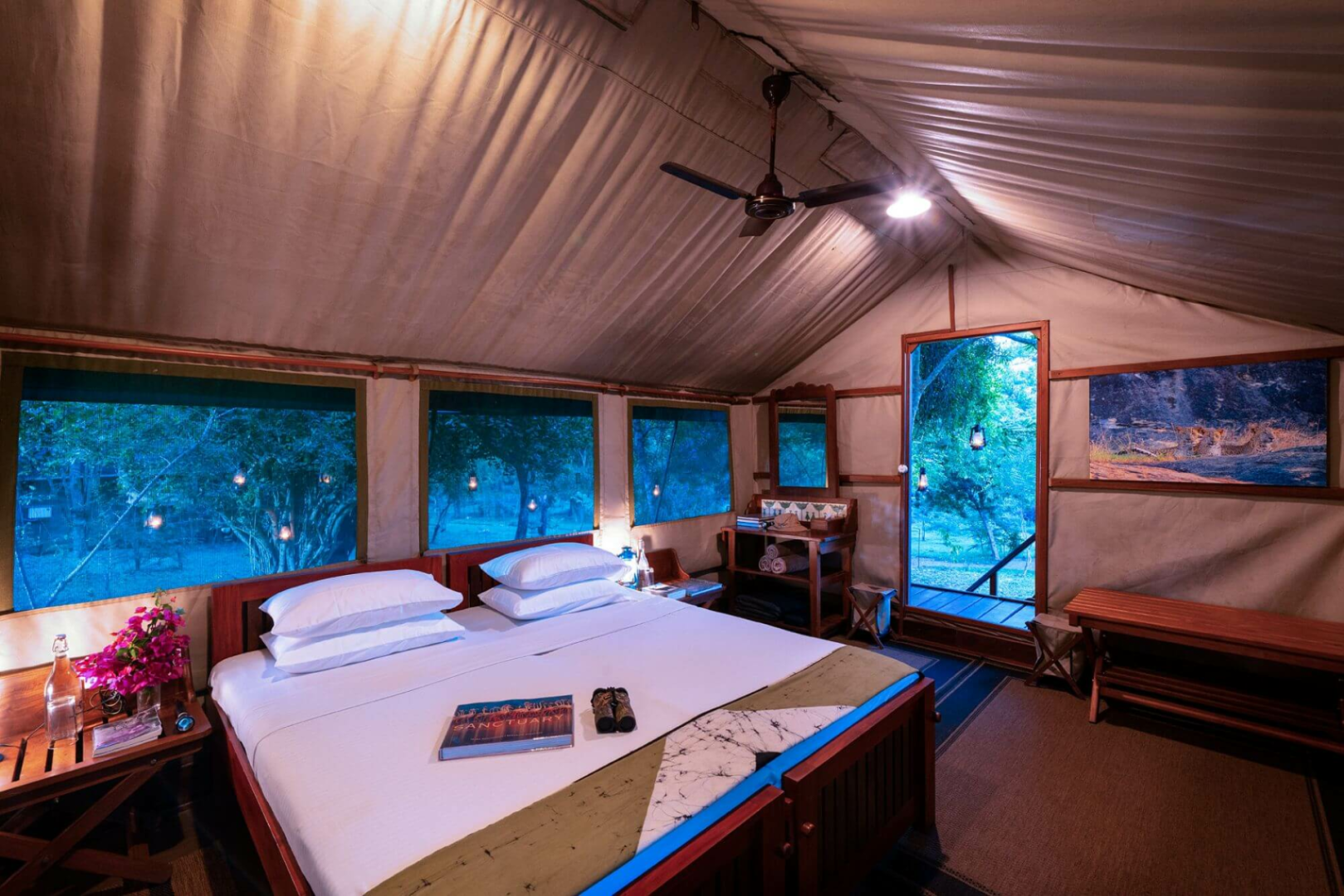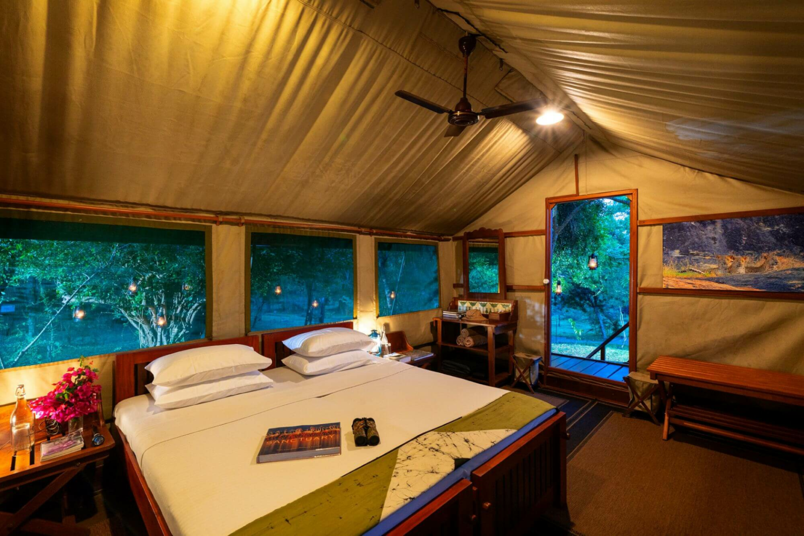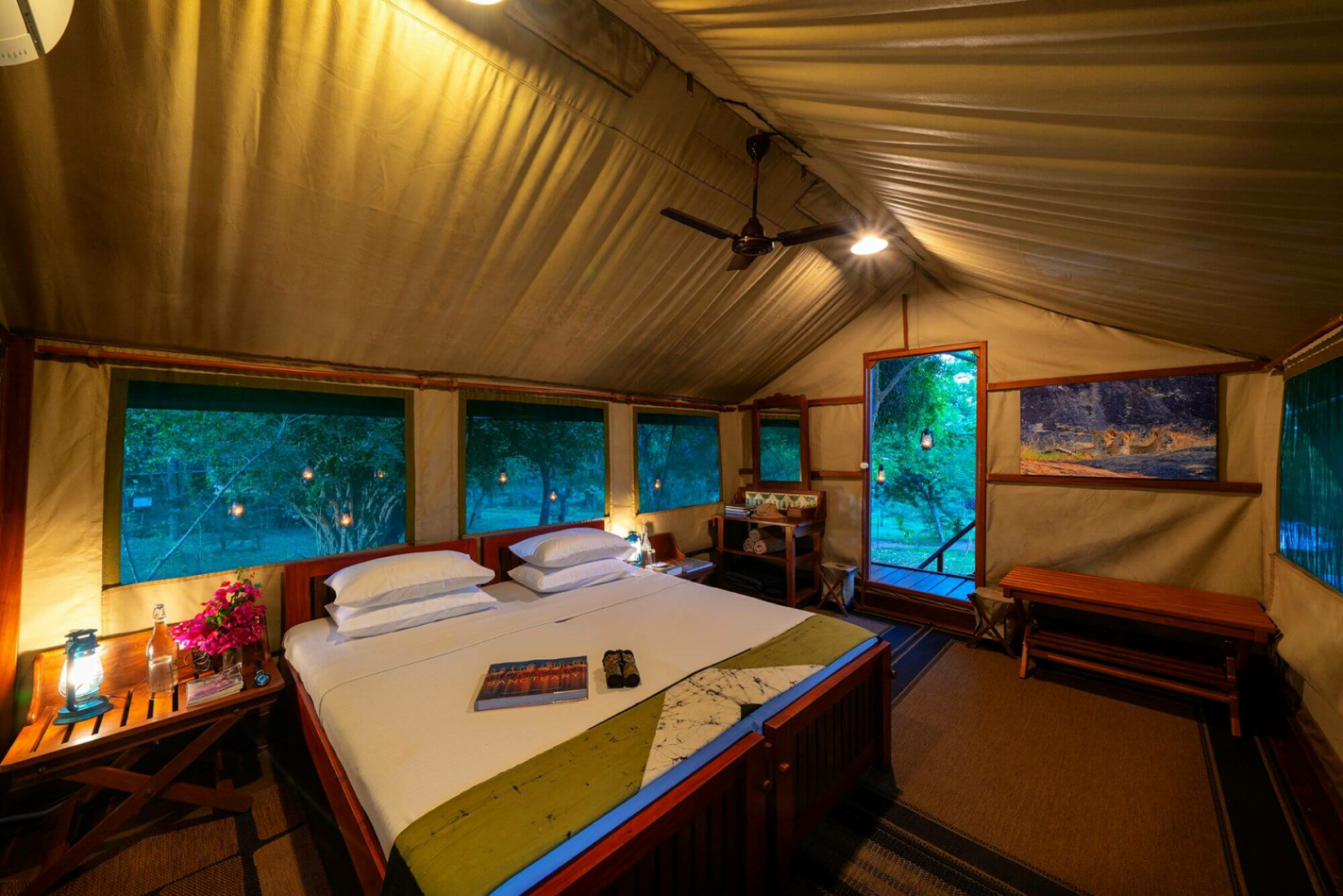 Alle 12 Safarizelte sind für srilankische Verhältnisse ziemlich luxuriös und stehen leicht erhöht auf Holzplattformen. Sie verfügen über eine private Veranda mit Stühlen und haben eine überraschend komfortable Innenausstattung mit einem großen Bett, Stauraum und eigenem Bad.